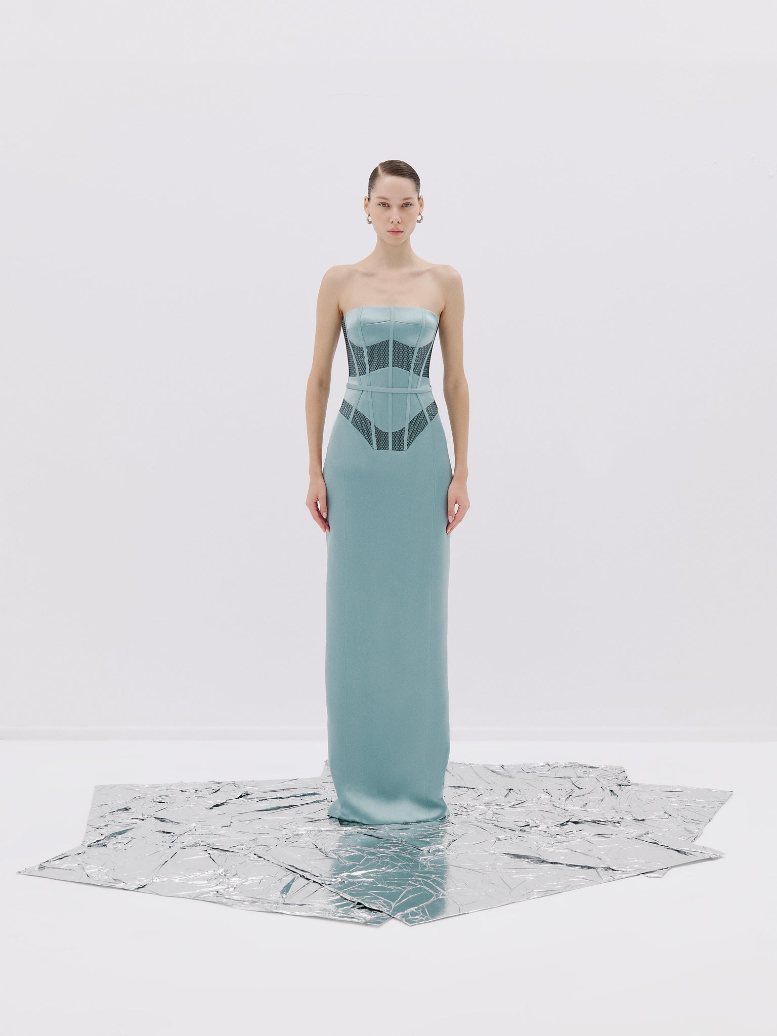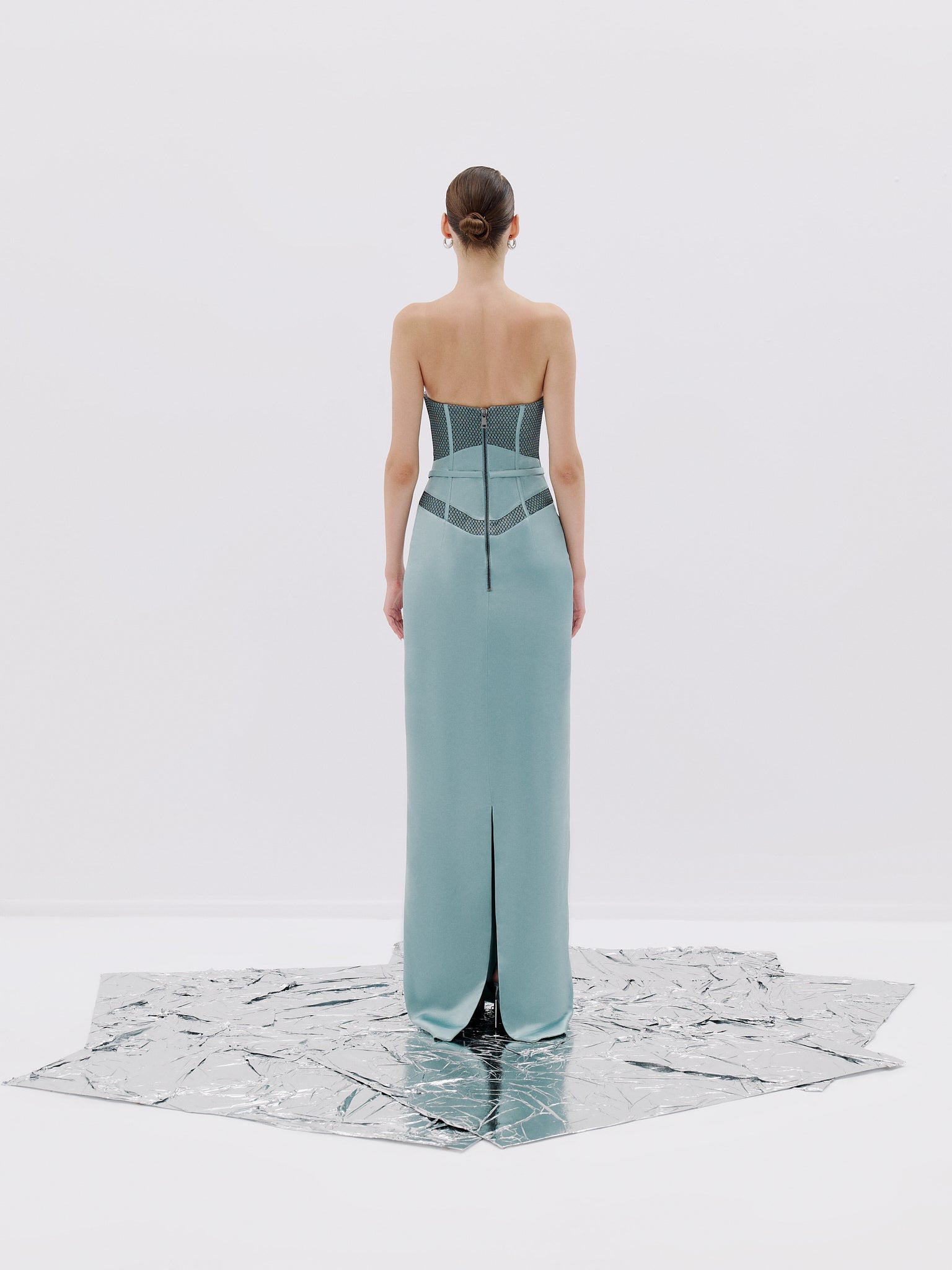 A strapless, form-fitting gown in a light teal color with with structered, corset- style detailing on the bodice, giving it a sleek, modern look. The dress features geometric patterns for added visiul interest.