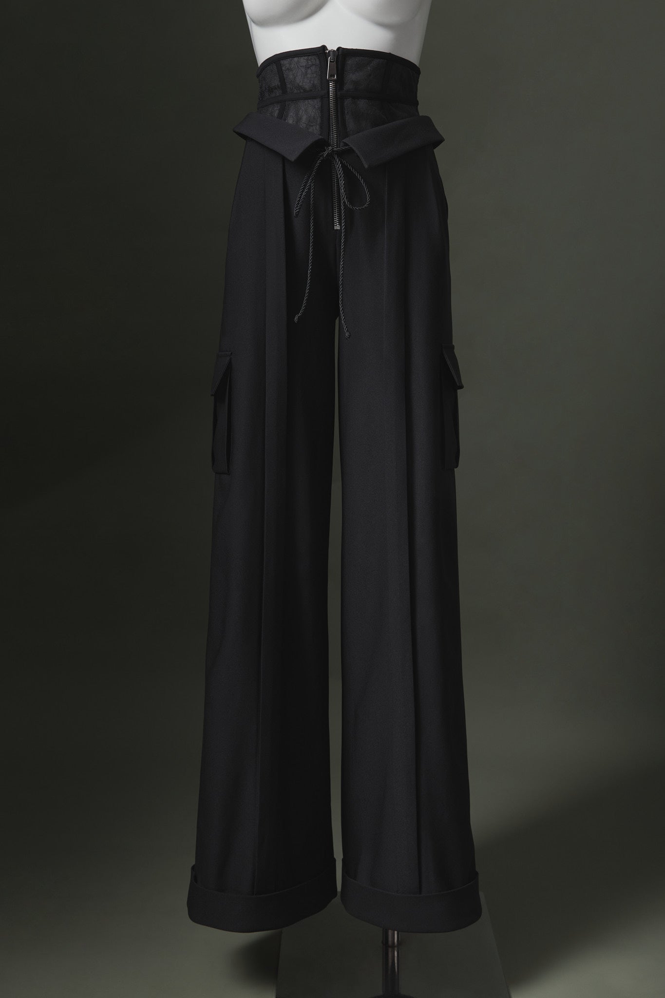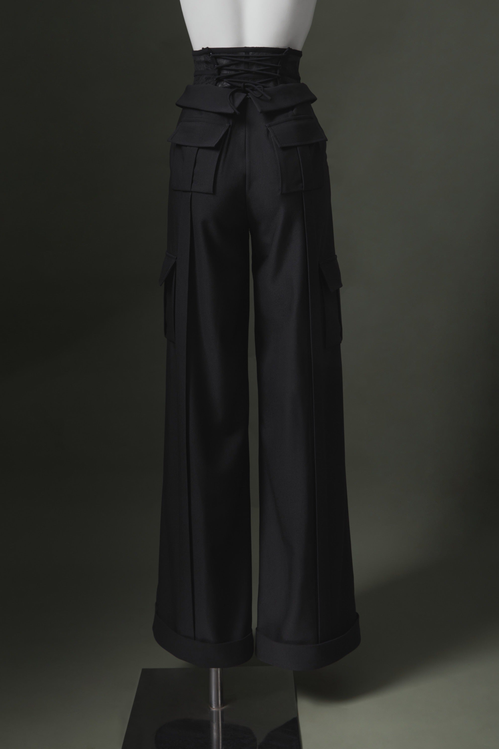 Double leg with adjustable laces at the back and pocket details, lace girdle pants.