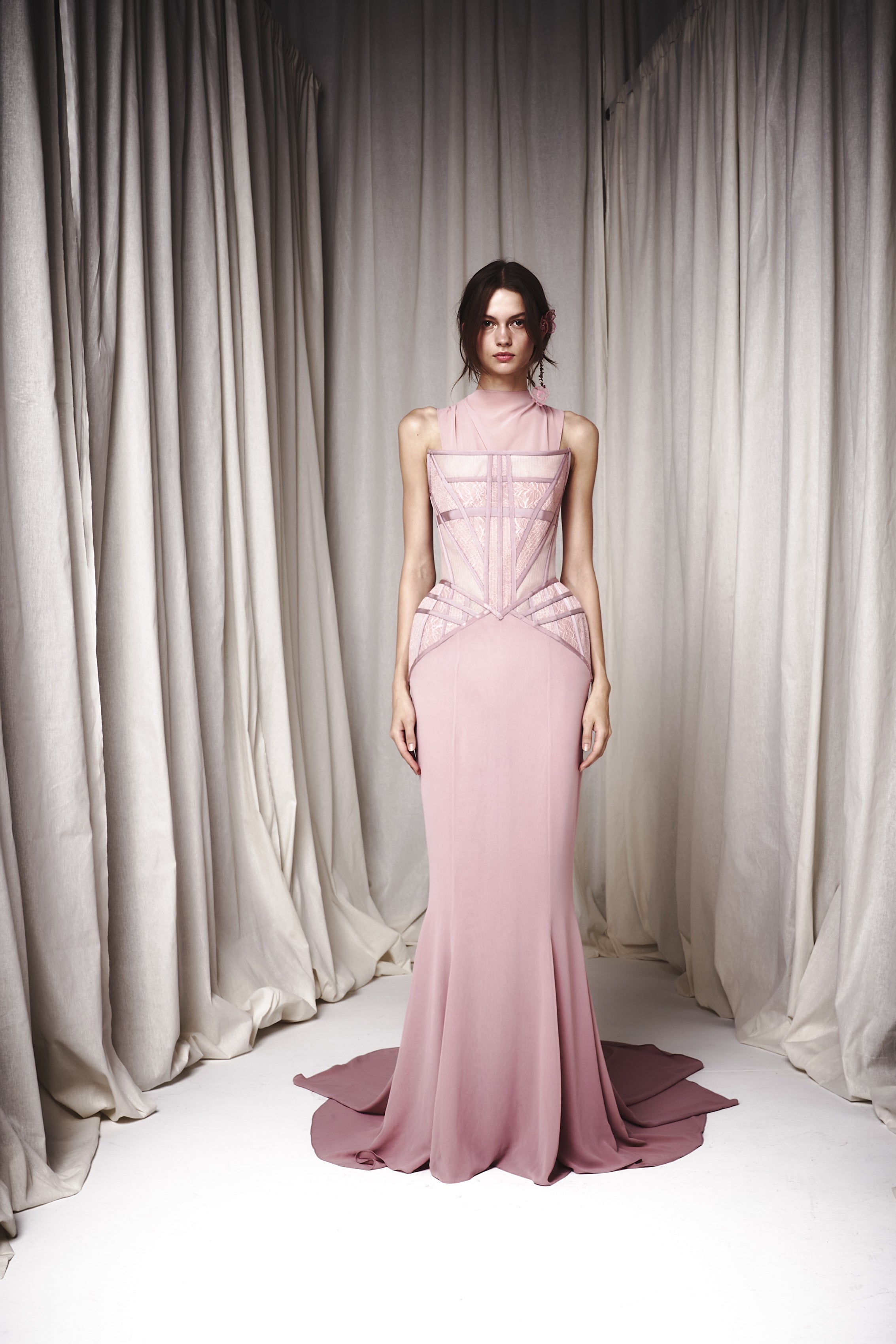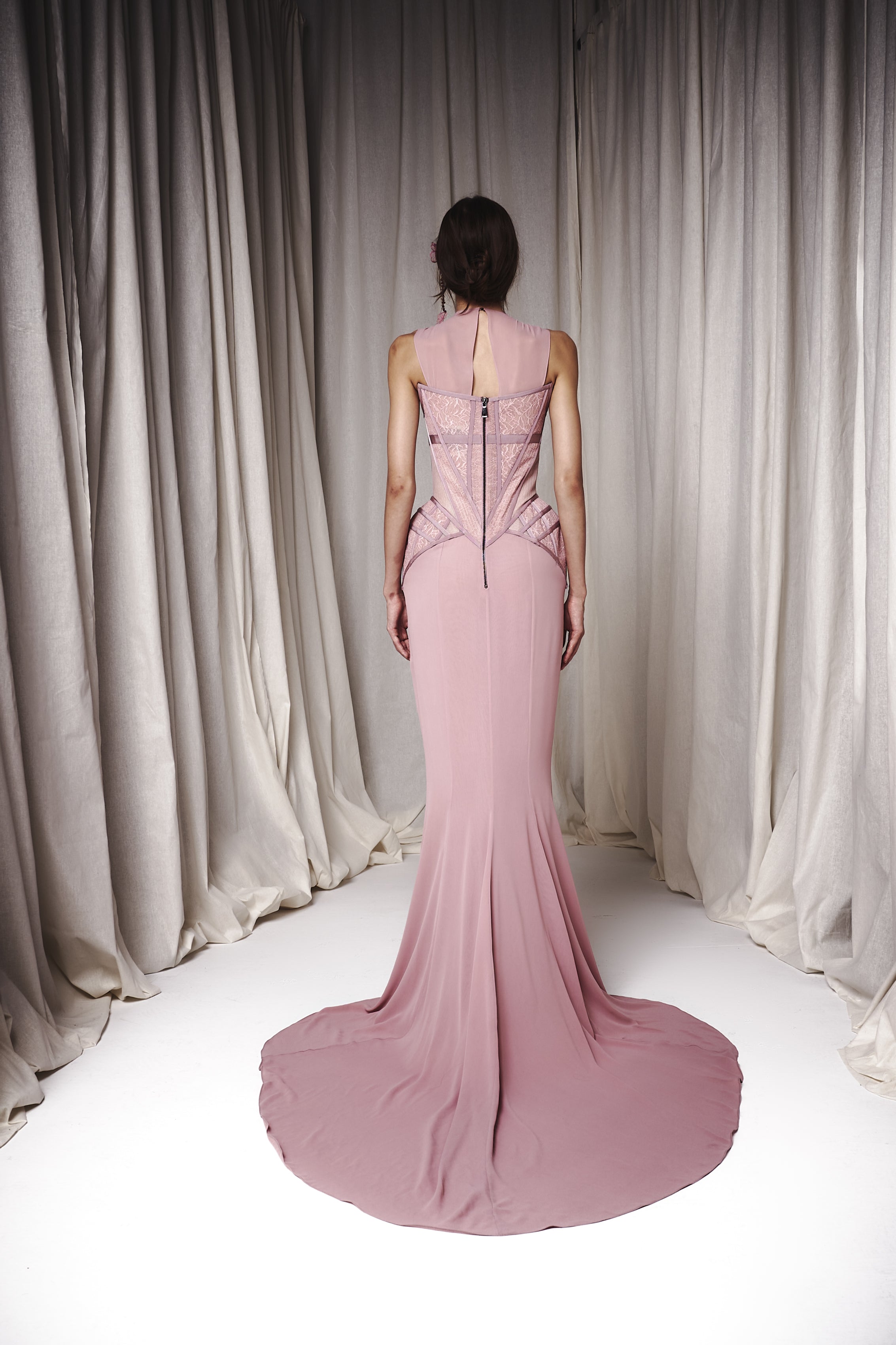 Halter neck maxi dress features lace corset part and zipper at the back.