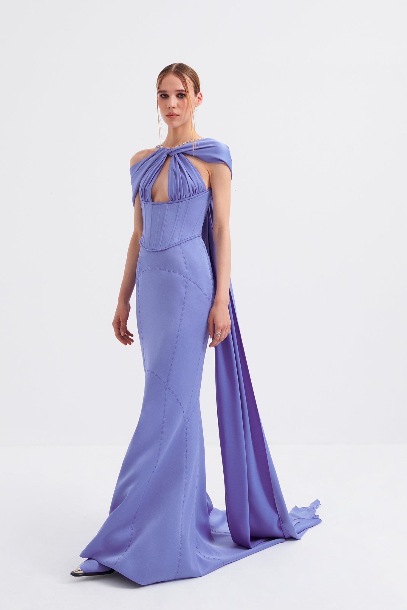 Corseted fitted silhouette halter neck off-the-shoulder gown with draped self-tie side tail. It features crystal- embellished metal chain accessories and hand stitching details. It fastens with a concealed back zip closure.