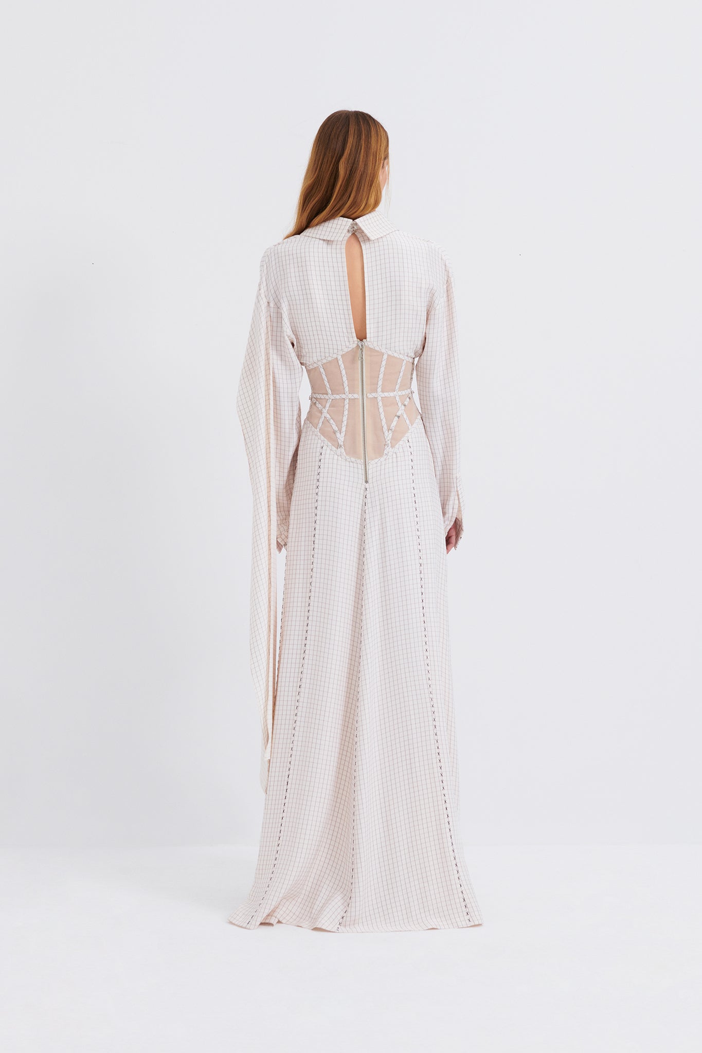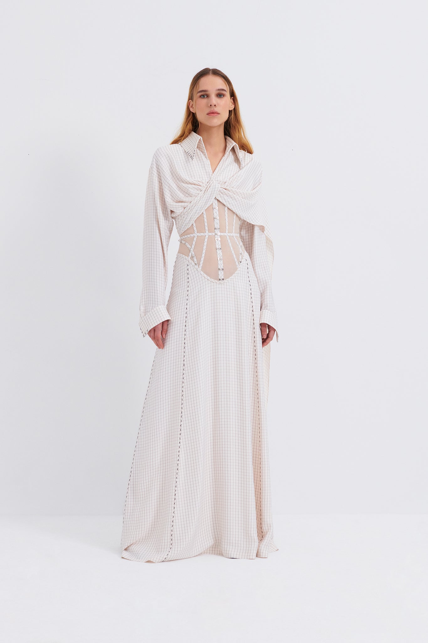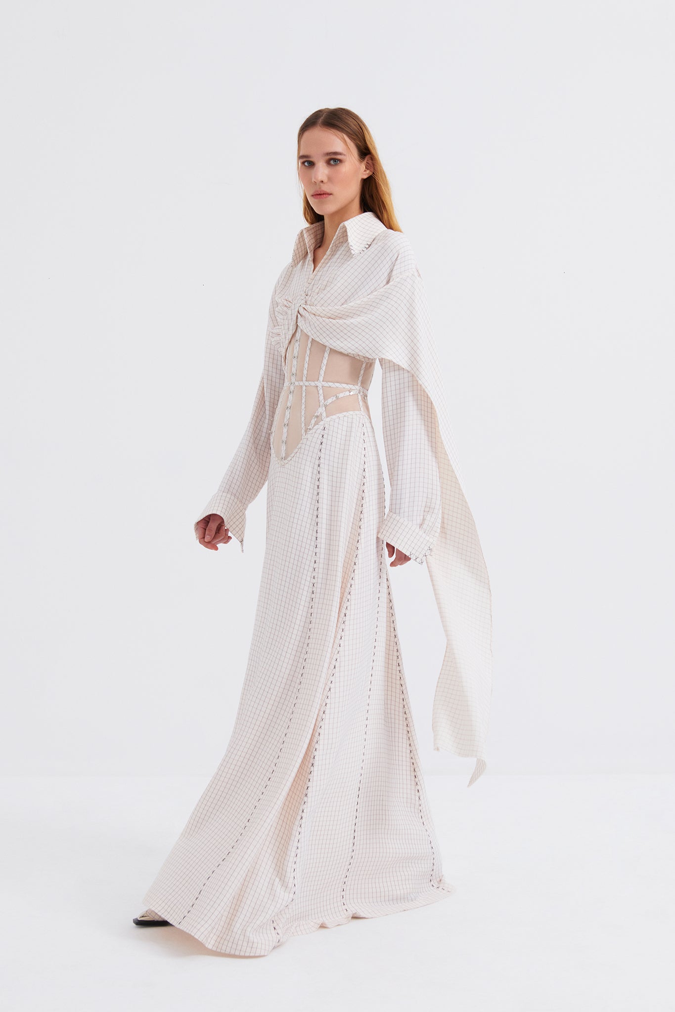 Corseted maxi shirt dress with draping and hand stitching details.It fastens with a visible metal back zip closure and has hook and eye detail on the corset.
