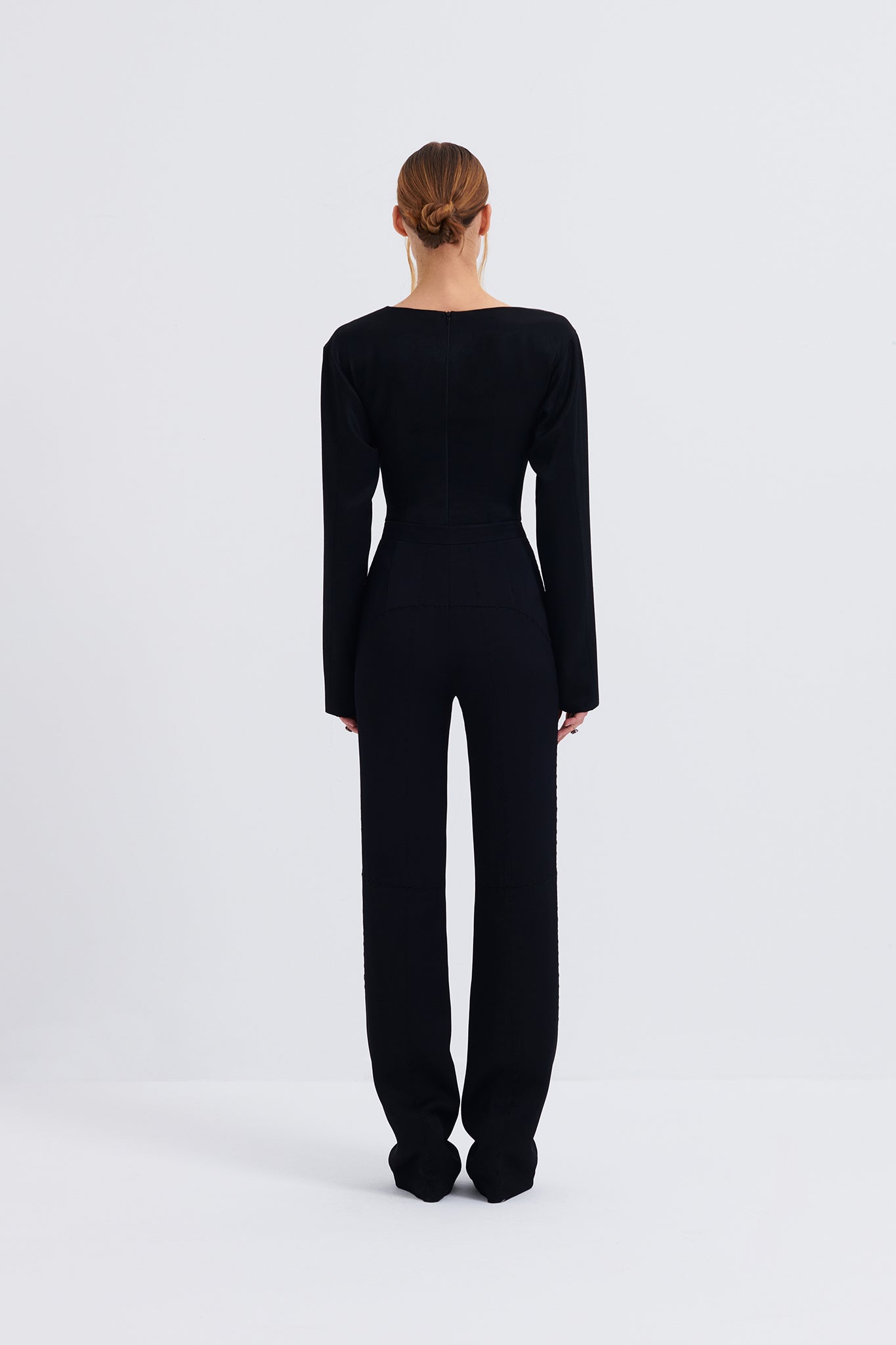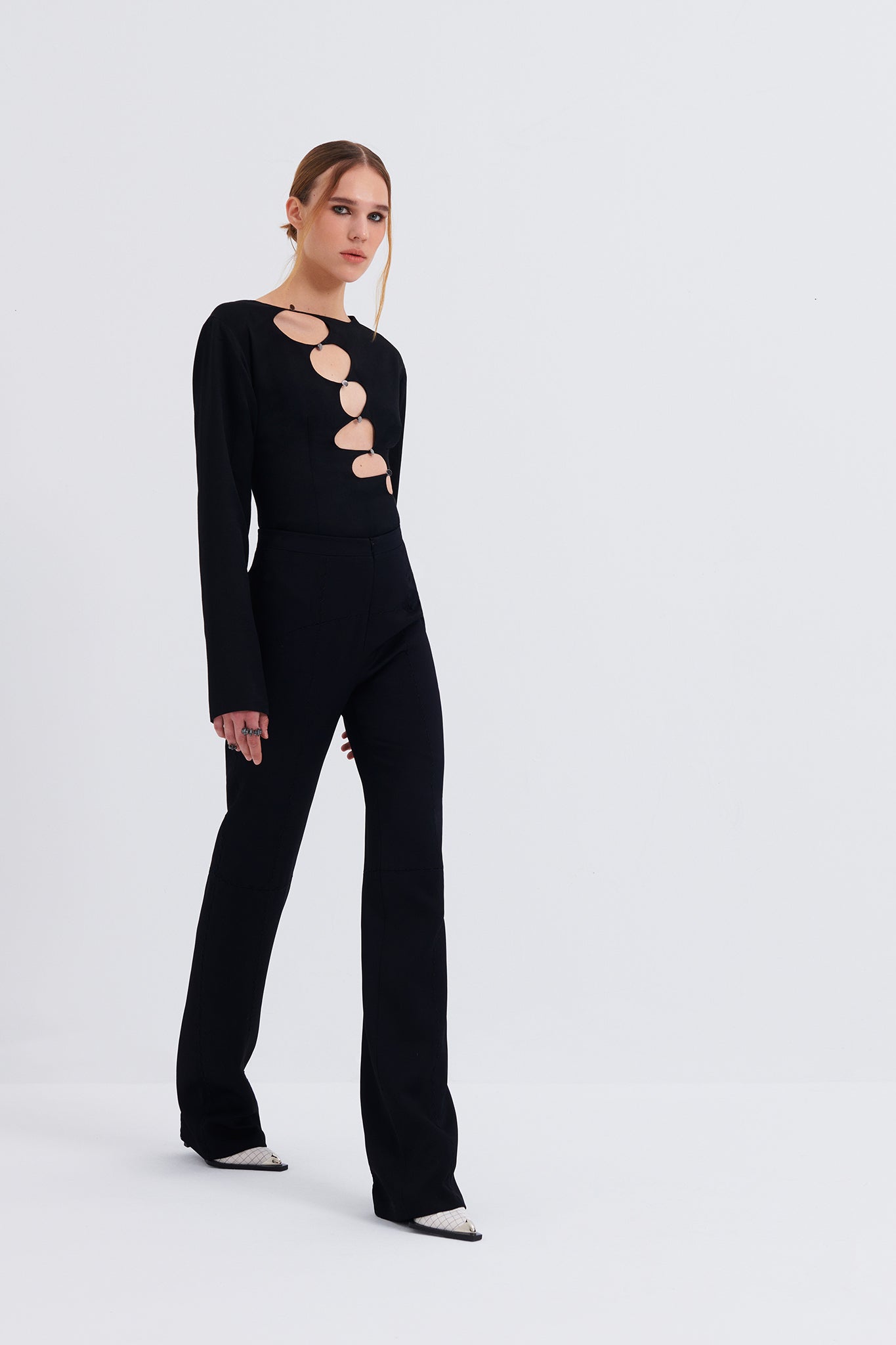 Cut-out long sleeved blouse features unfunctional metal buttons and a concealed back zip closure.