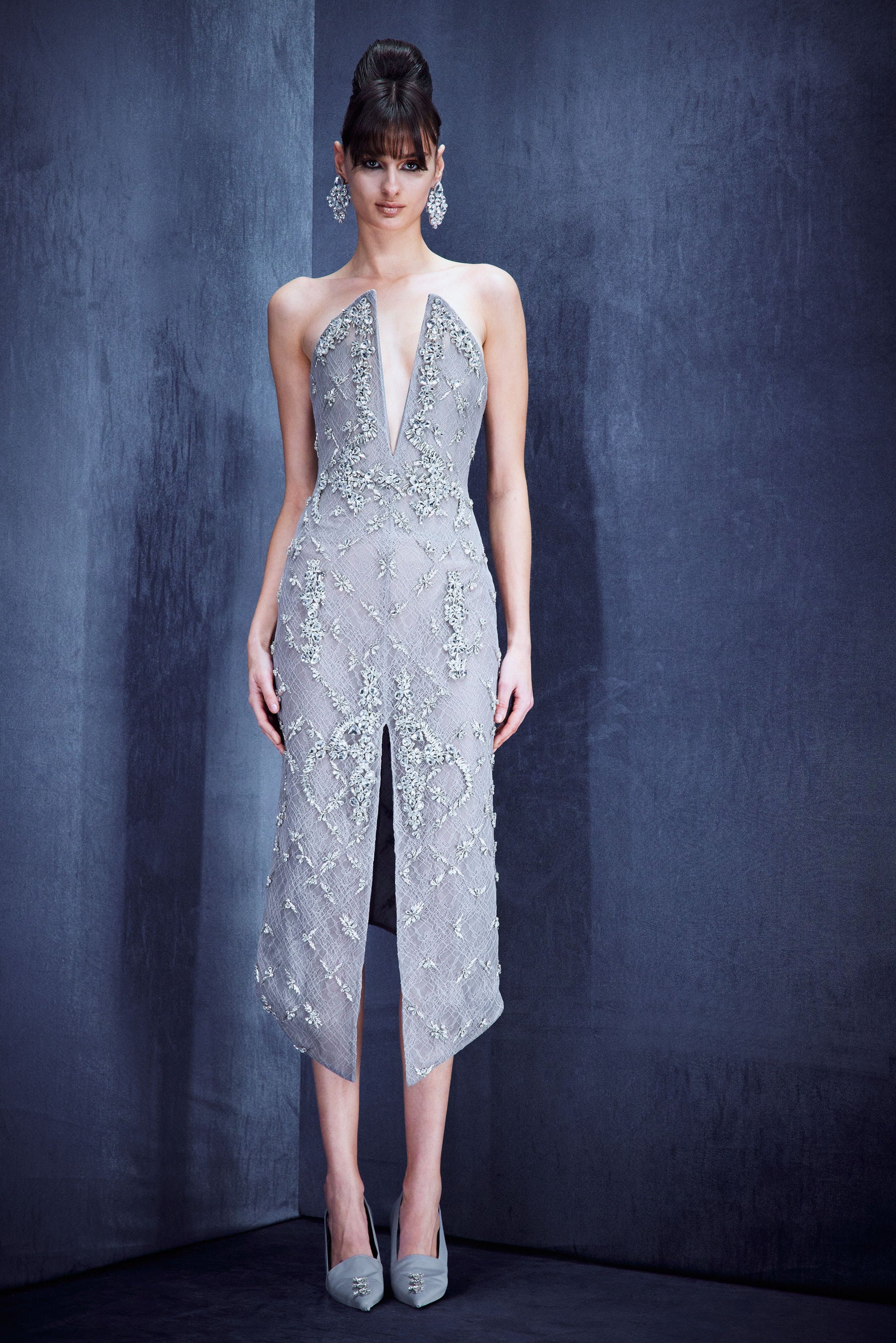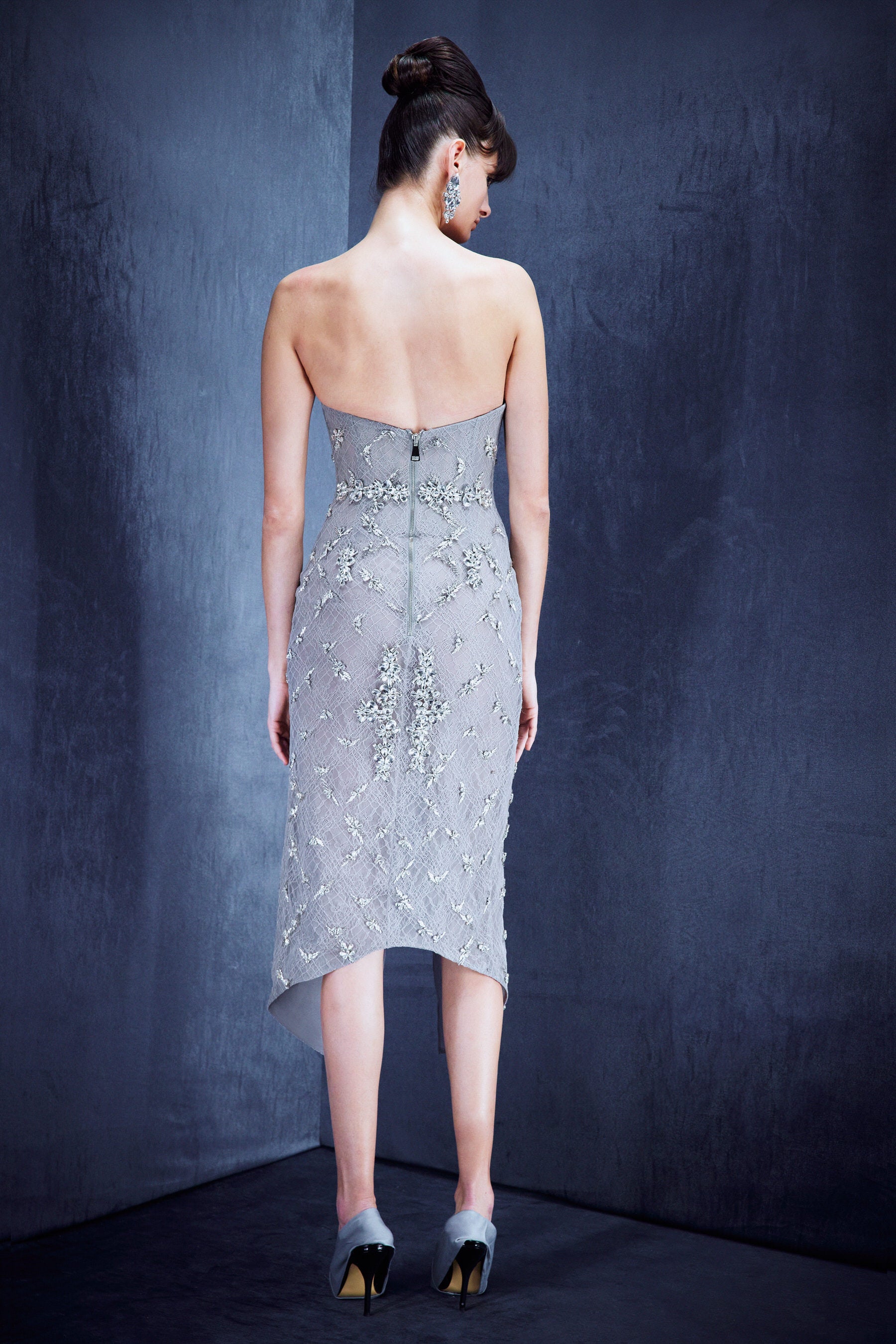 Midi embroidered lace dress with invisible corset, slit in front and the zipper at the back.