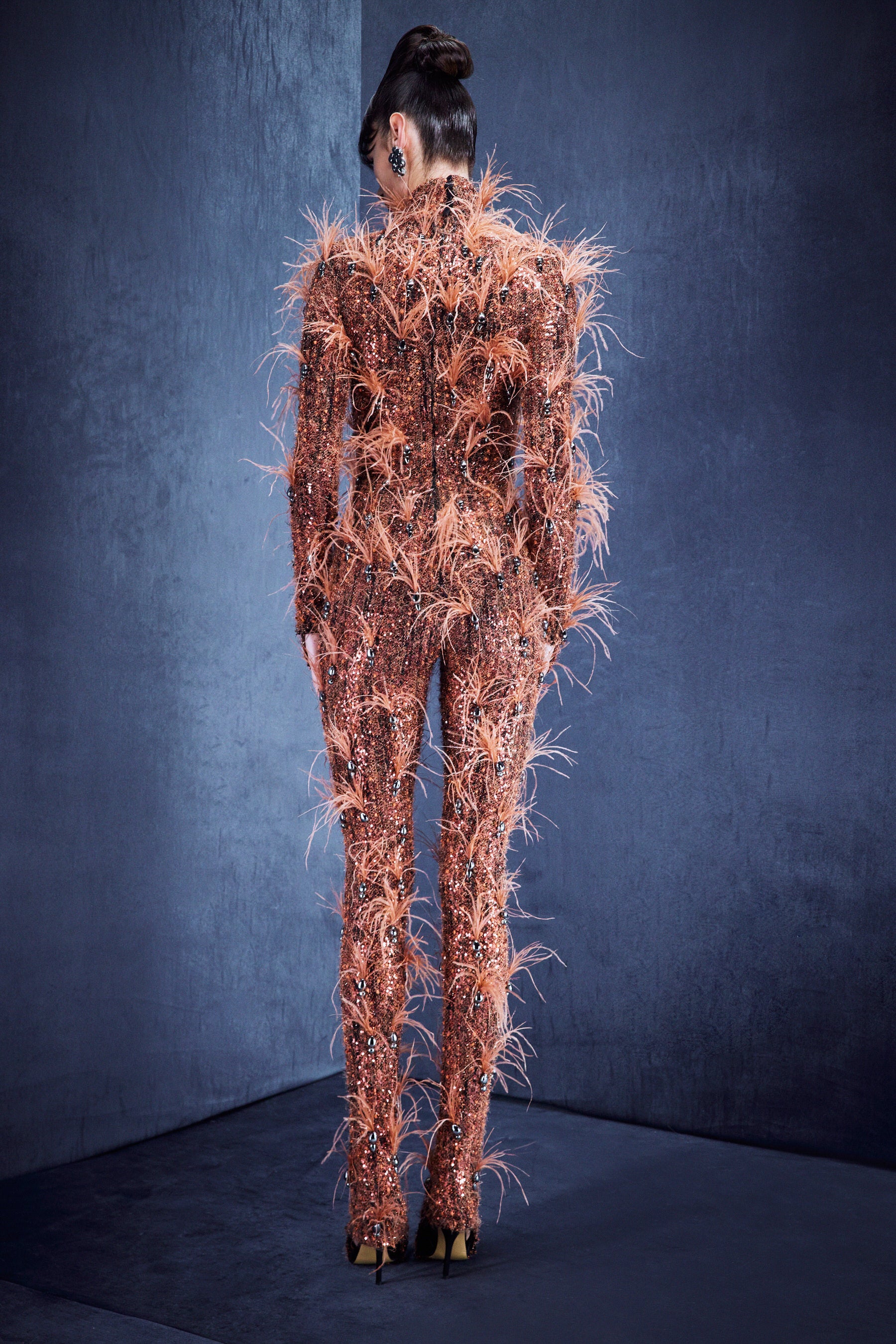 Sequined jumpsuit featured faux feathers, beads and invisible zipper at the back.