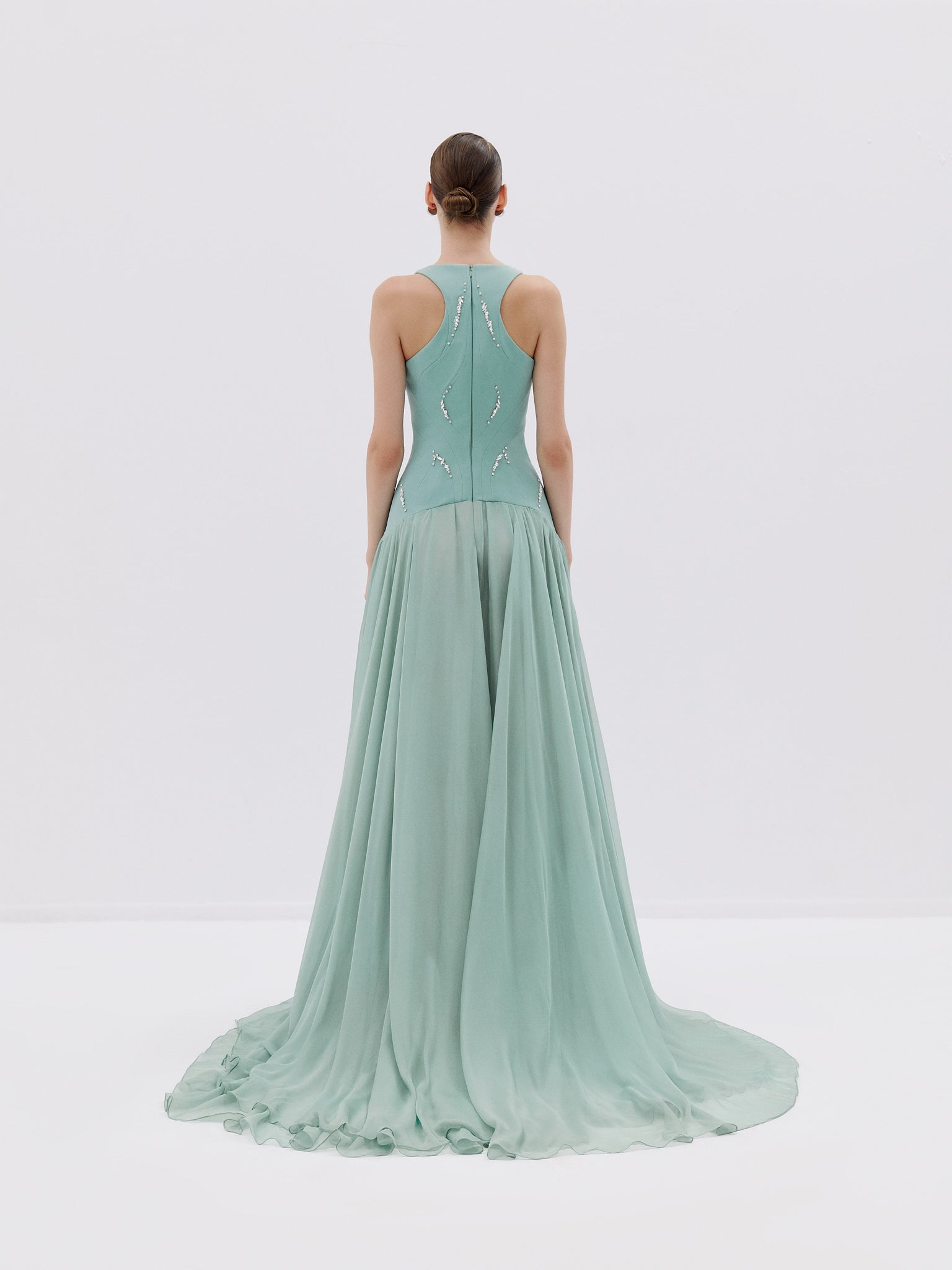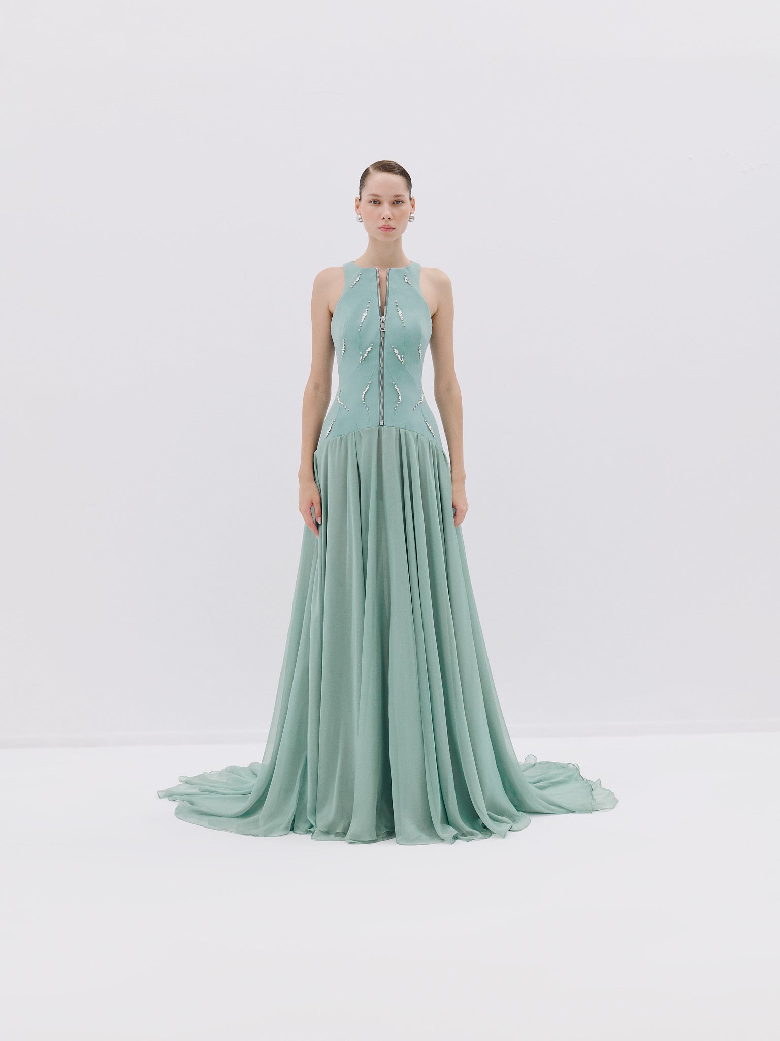 The dress flows into a voluminous, floor-lenght skirt with soft, flowing fabric, creating yet elegant silhouette.
