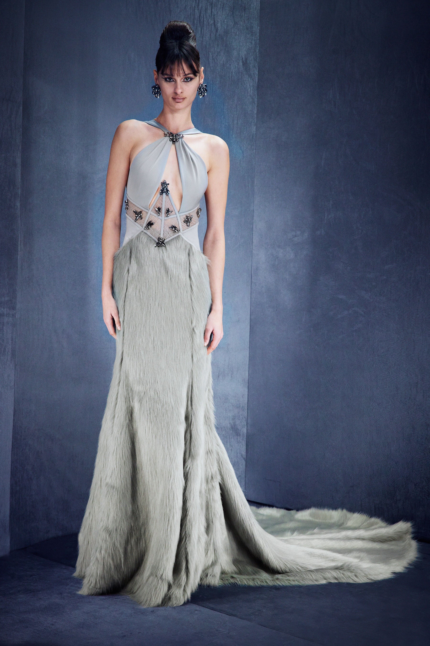 Halter neck embroidered corseted top paired faux fur skirt with mermaid cut.