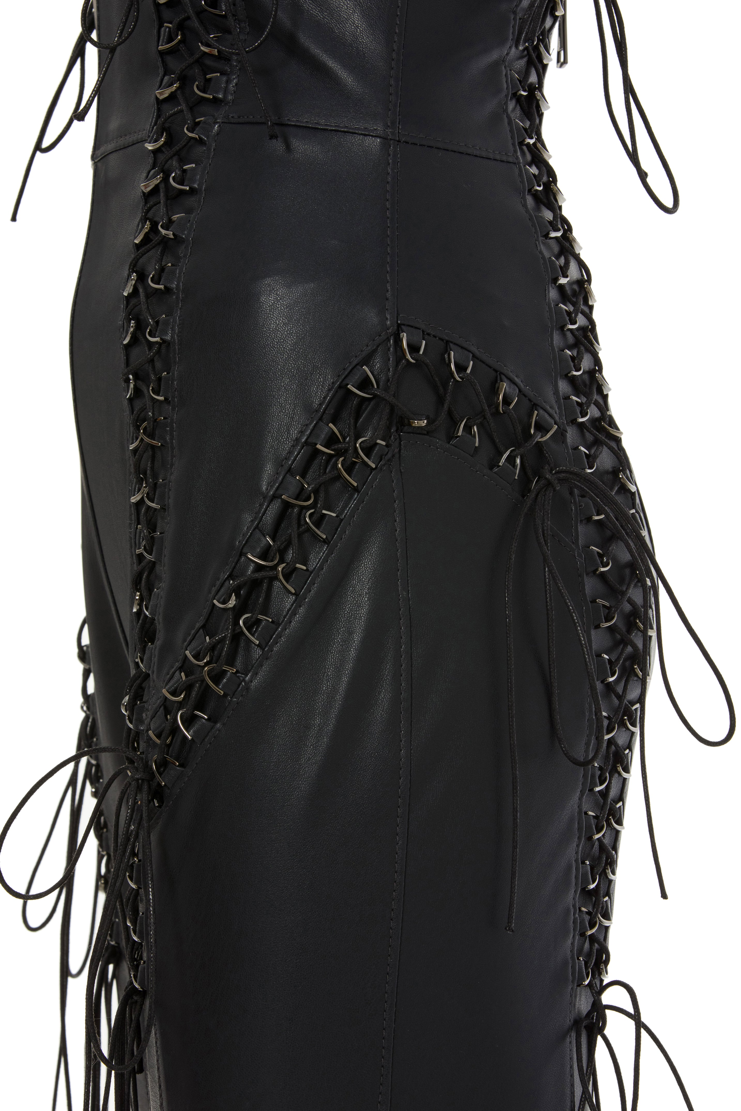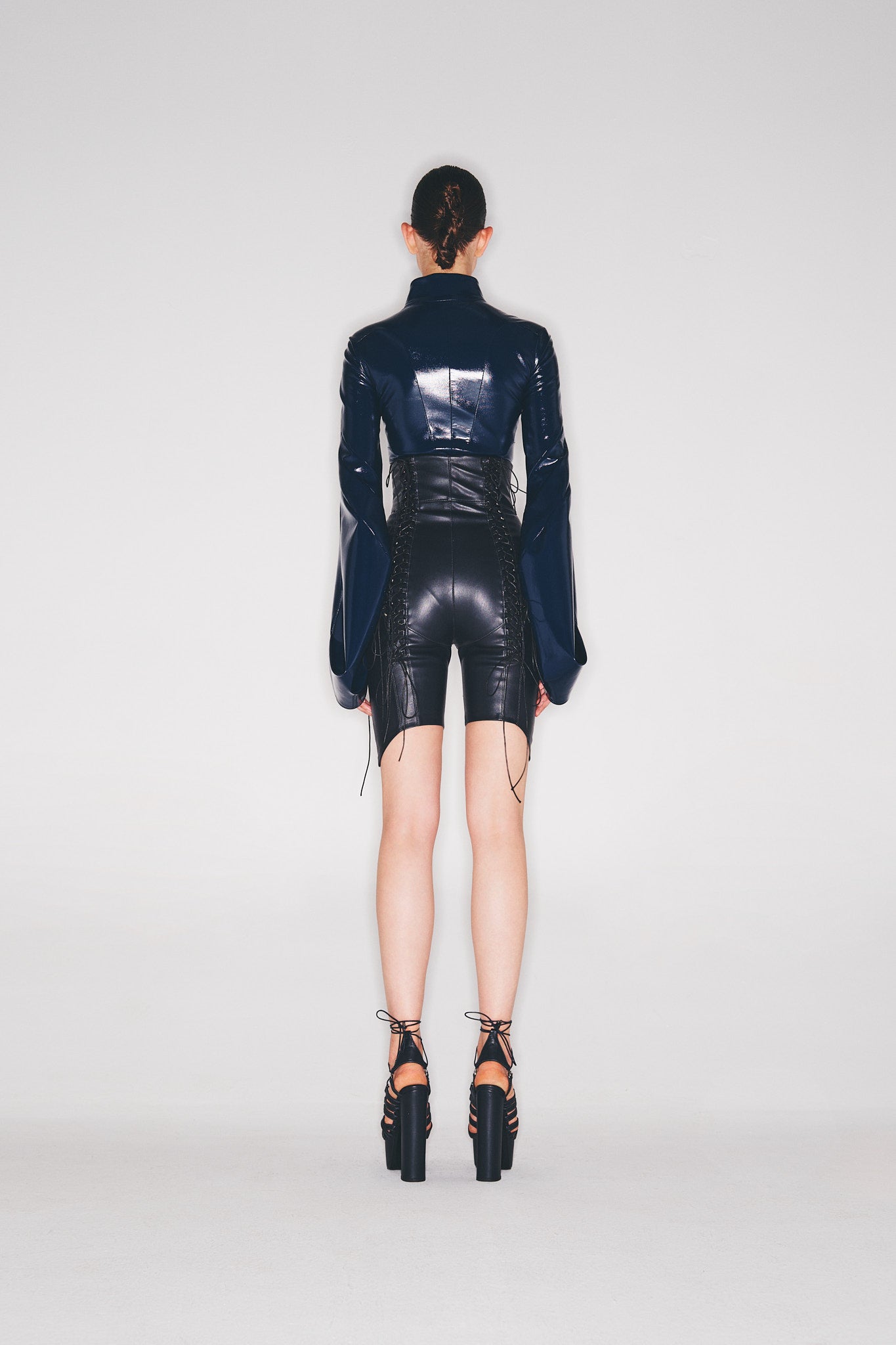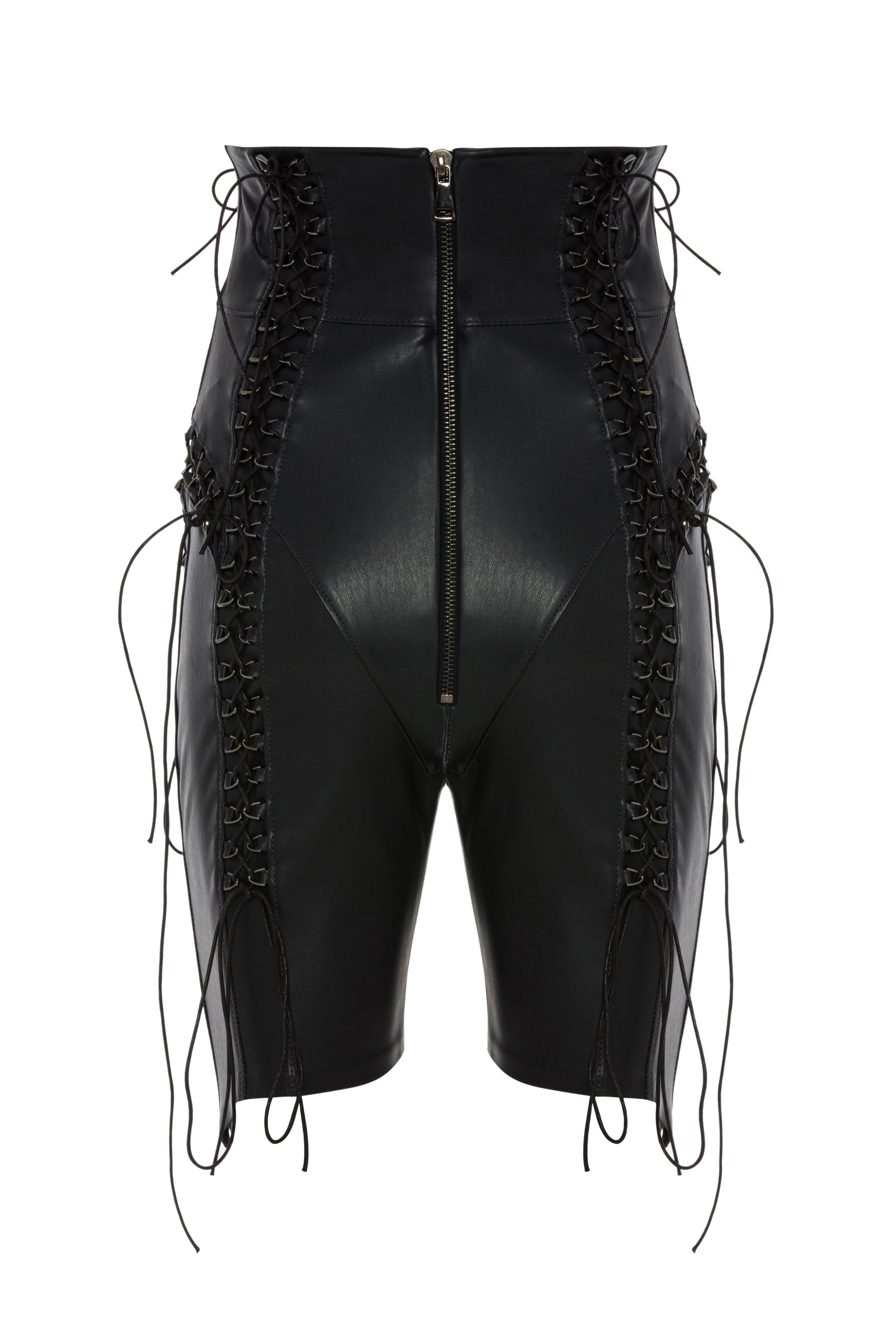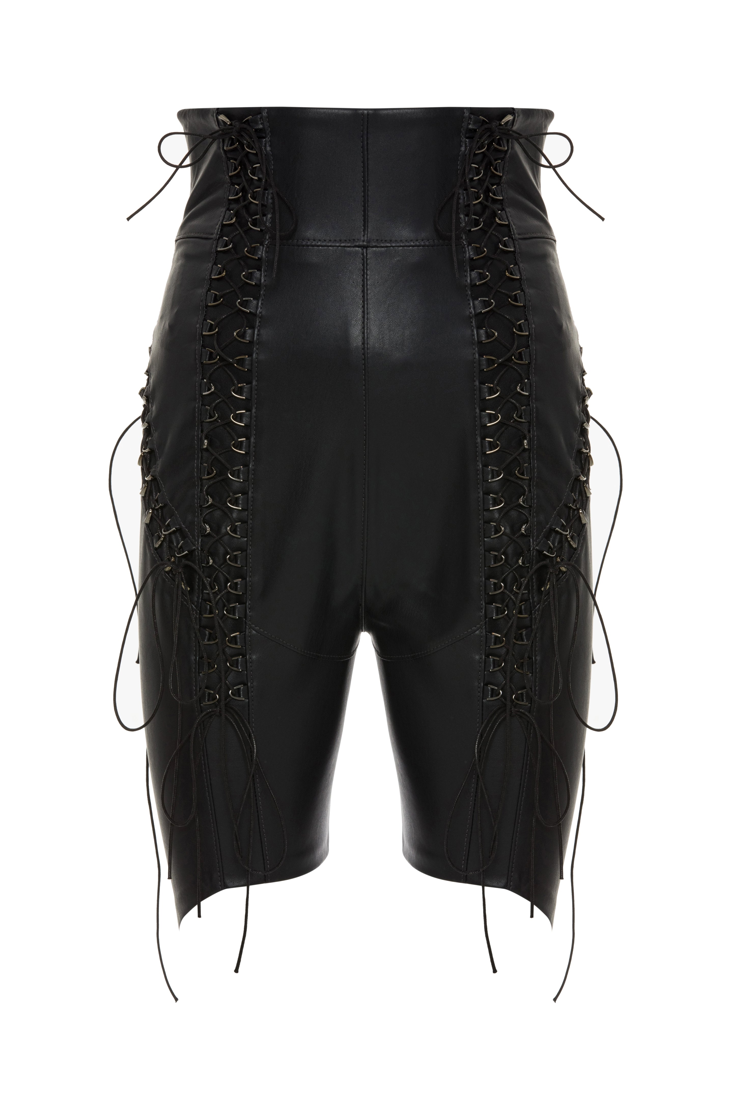 High-waisted vegan leather shorts with lacing and eyelet details.