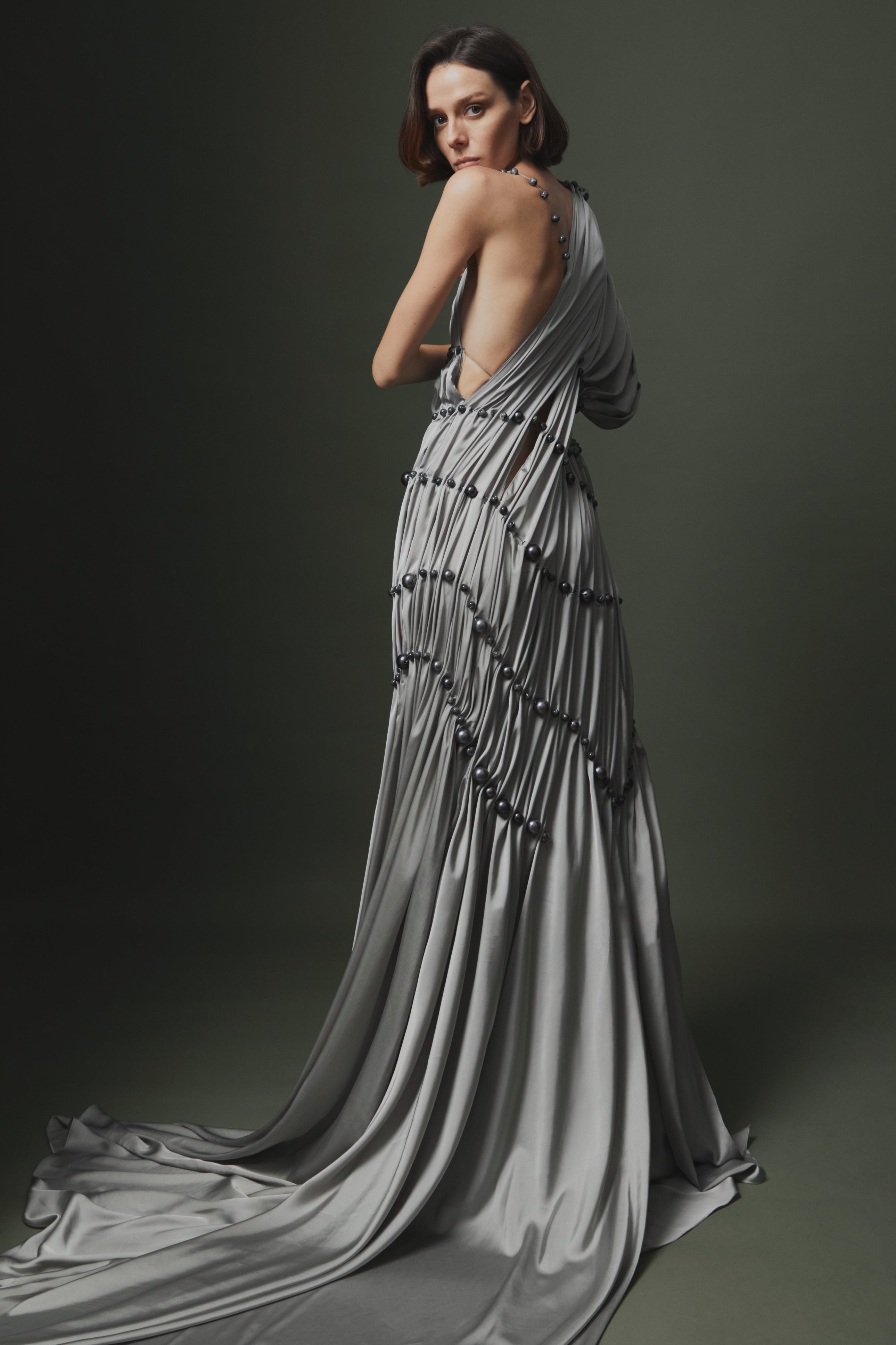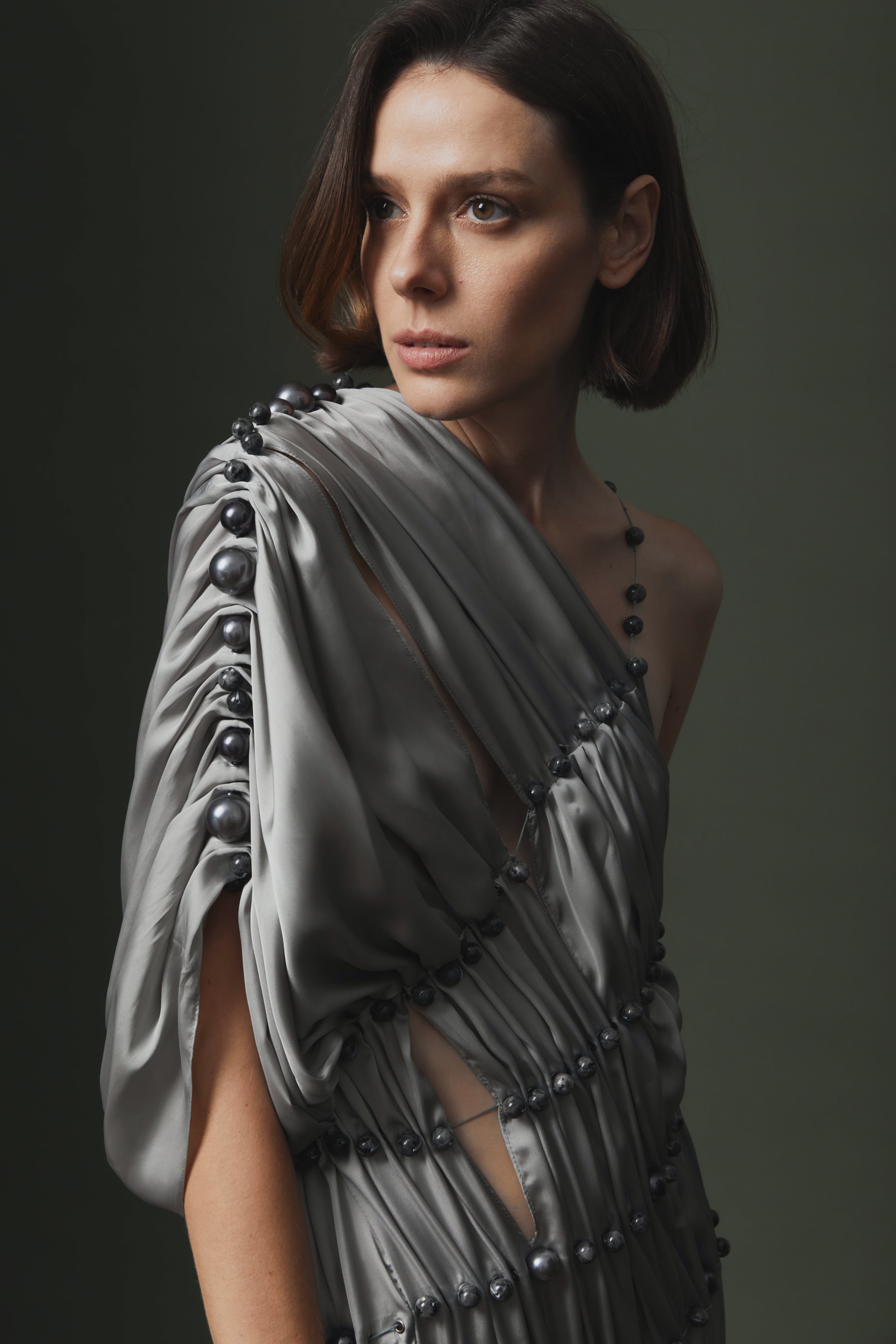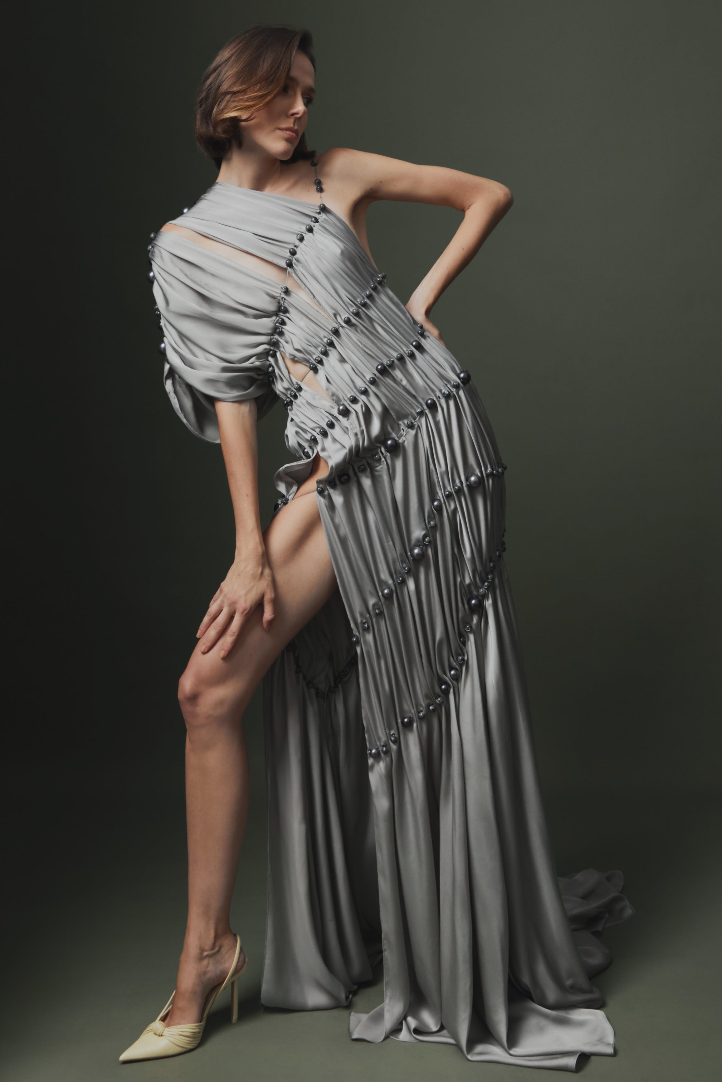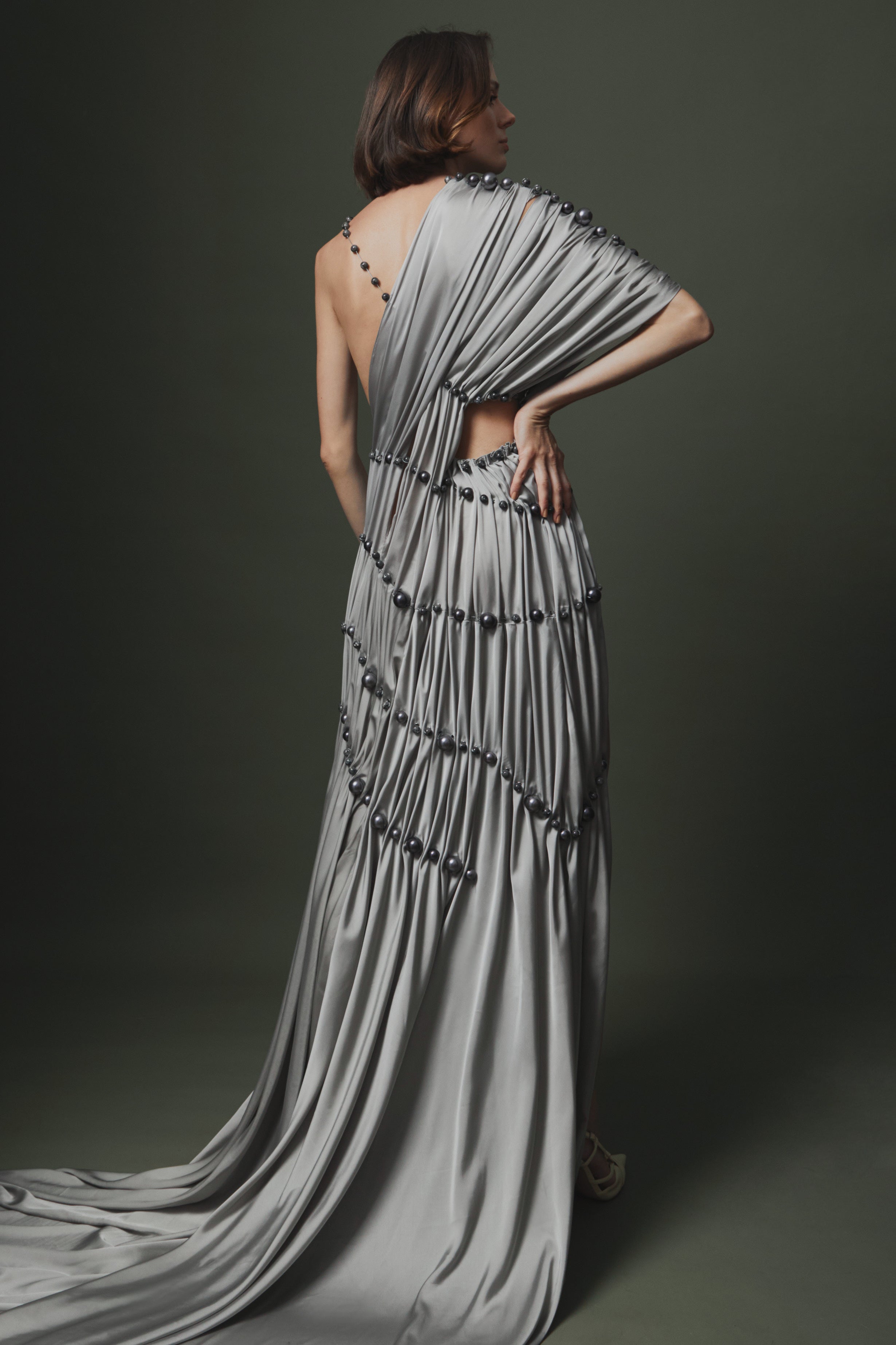 Dress with natural stones and drapery embroidered on it in thin strips, with natural stones and drapery, which is decorated with bird's eyes and symbolizes a bust. Made of silk satin fabric.