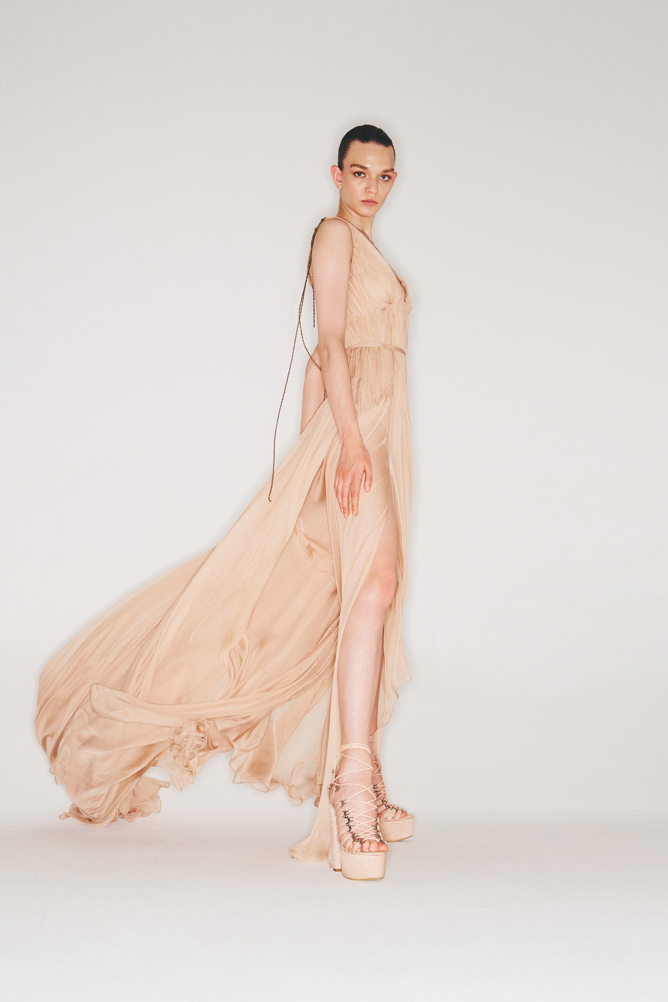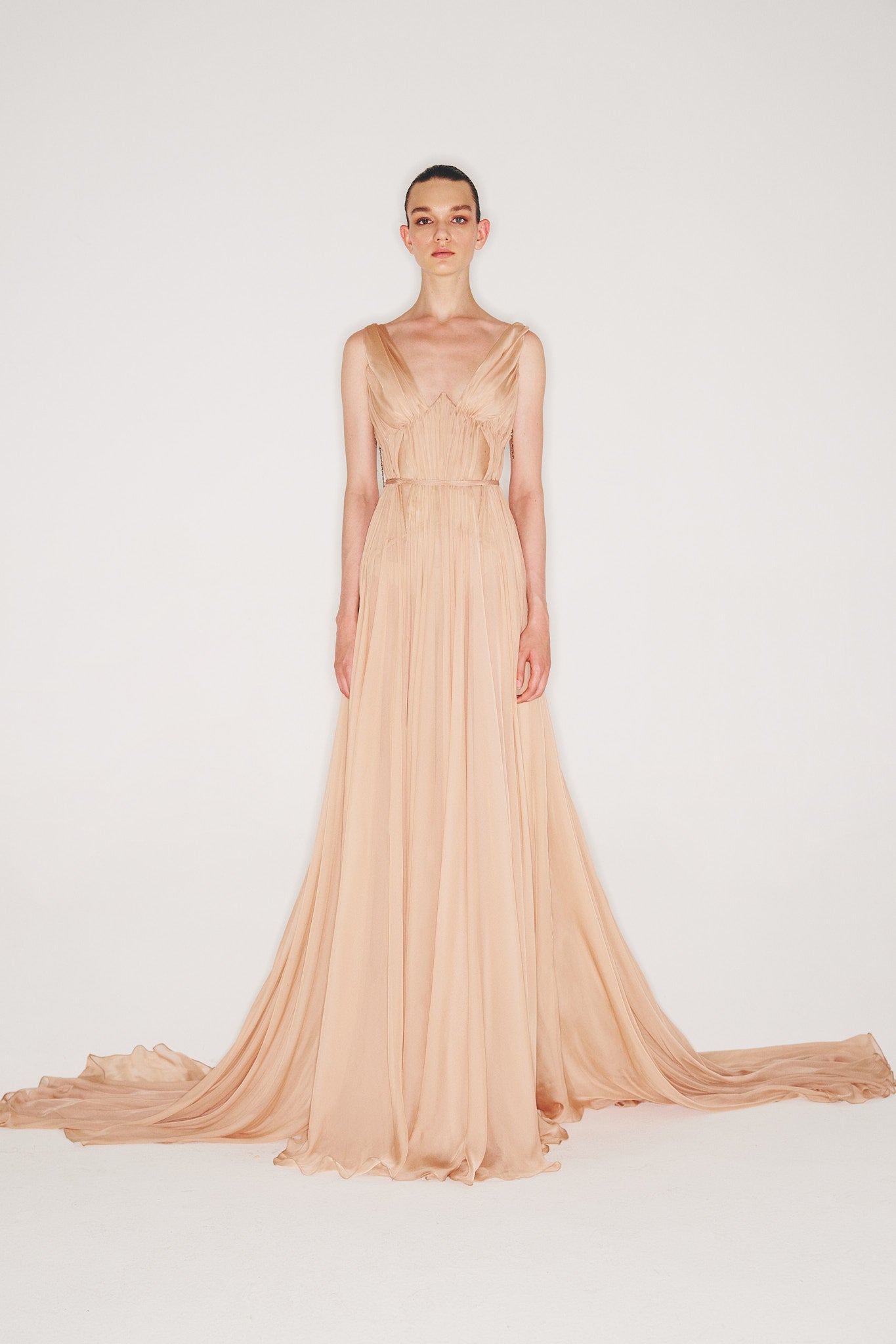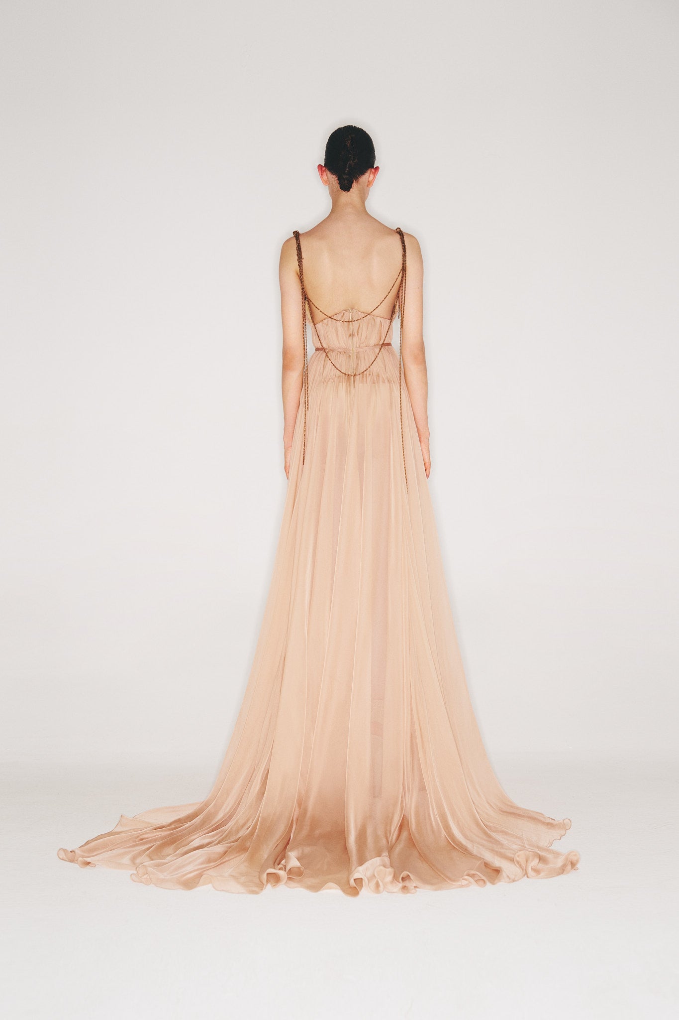 V-neck corset silk-chiffon maxi dress with side slit and copper chain details.