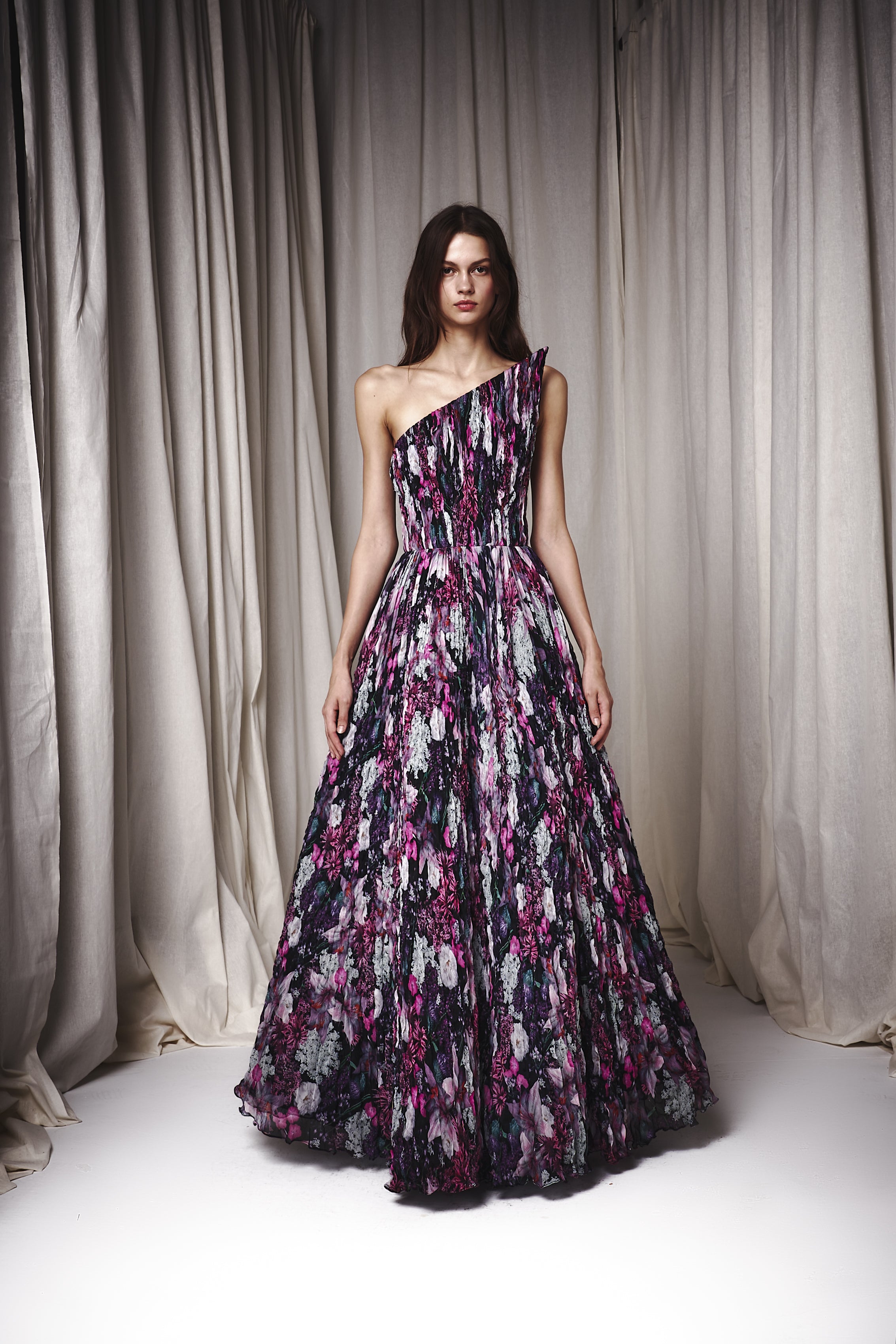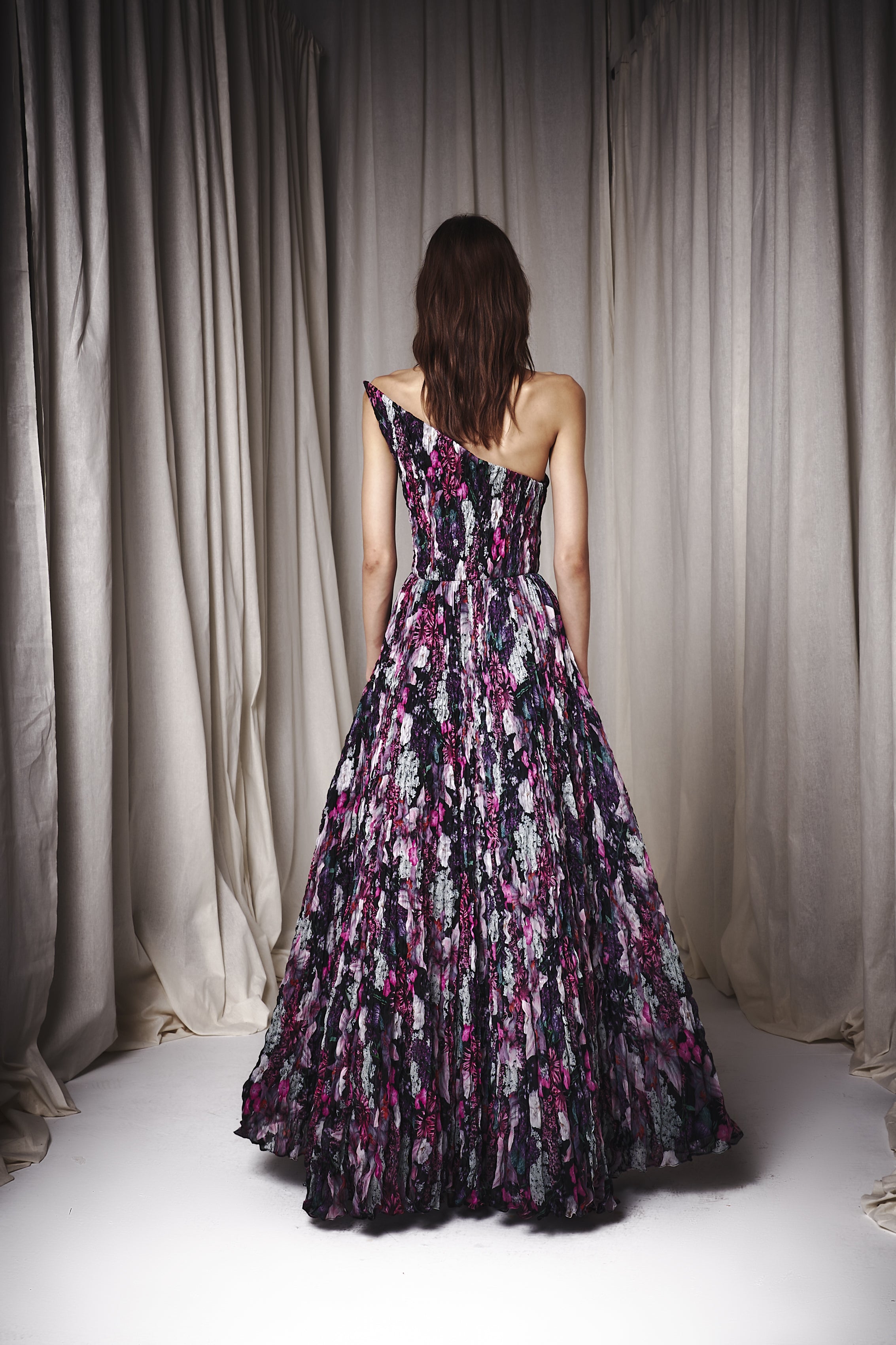 Printed maxi dress features corset, pleated skirt and invisible zipper on the side.