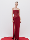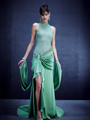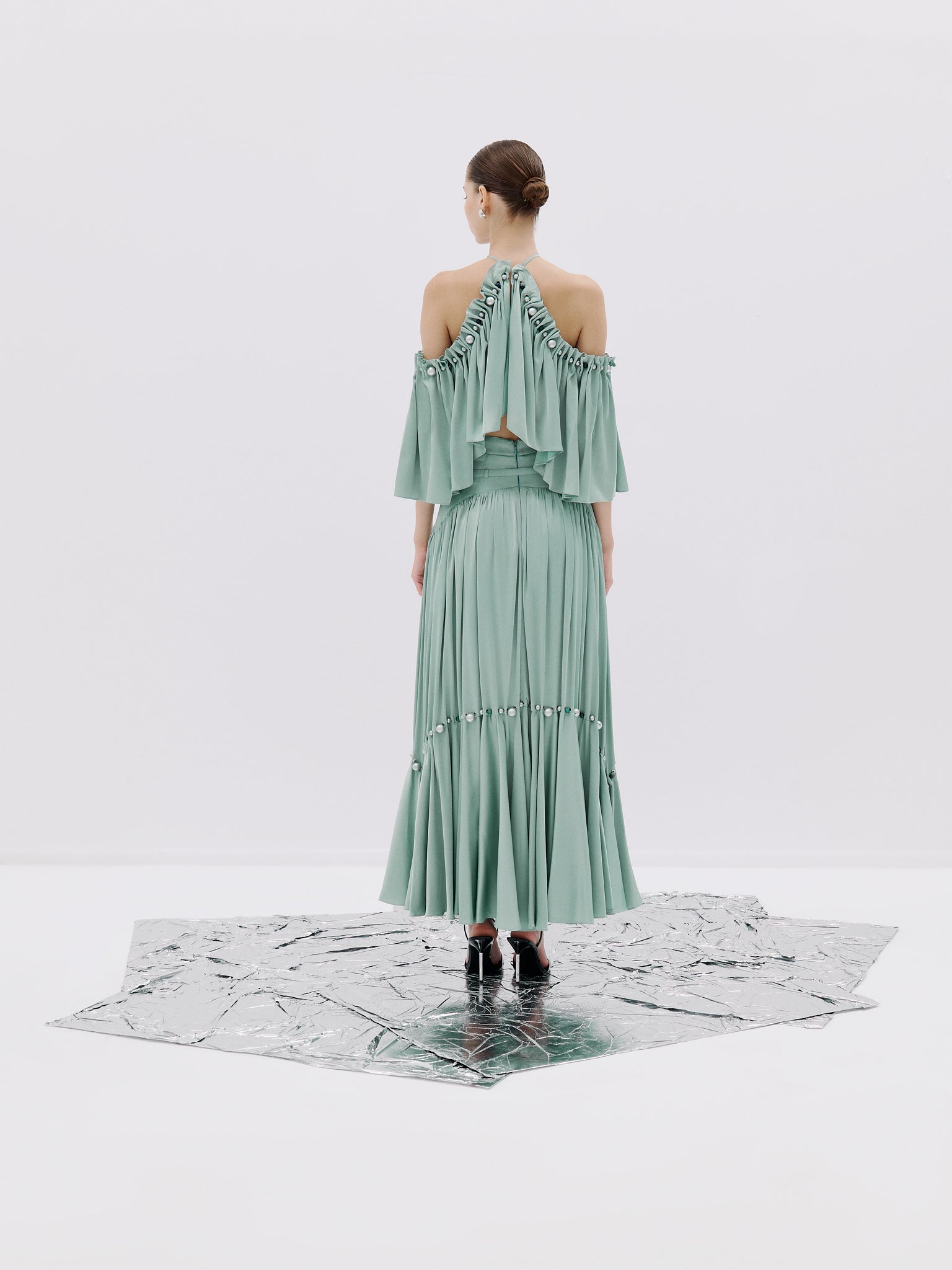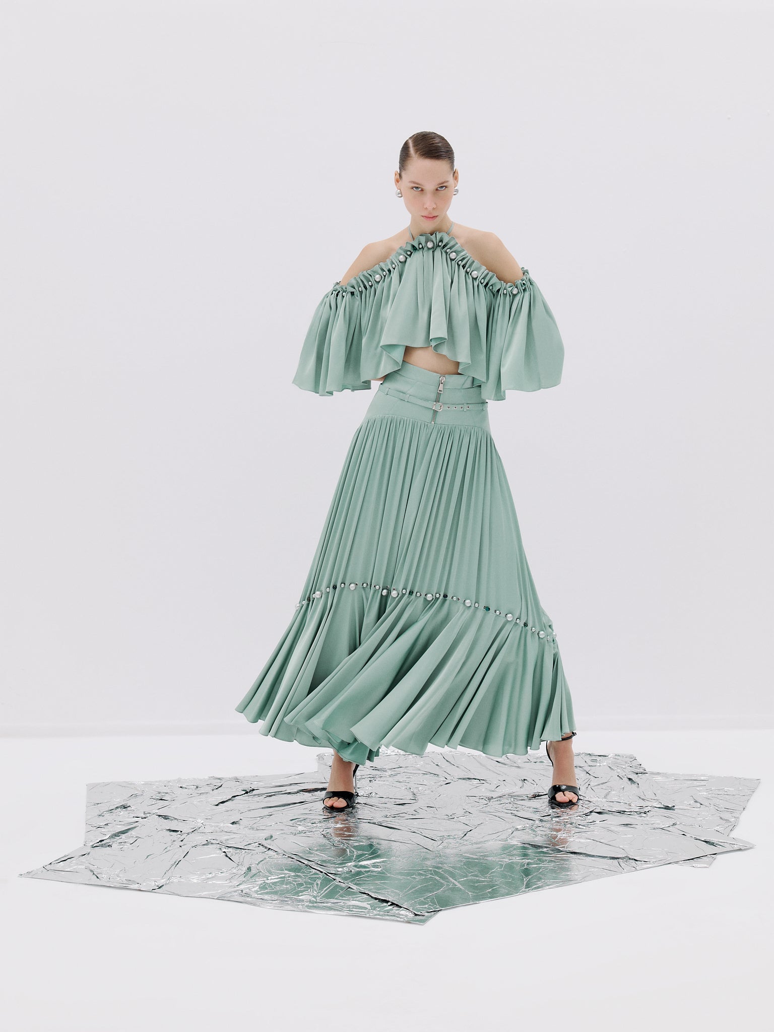 Mint green pleated skirt with belt, zipper, and pearl embellishments.