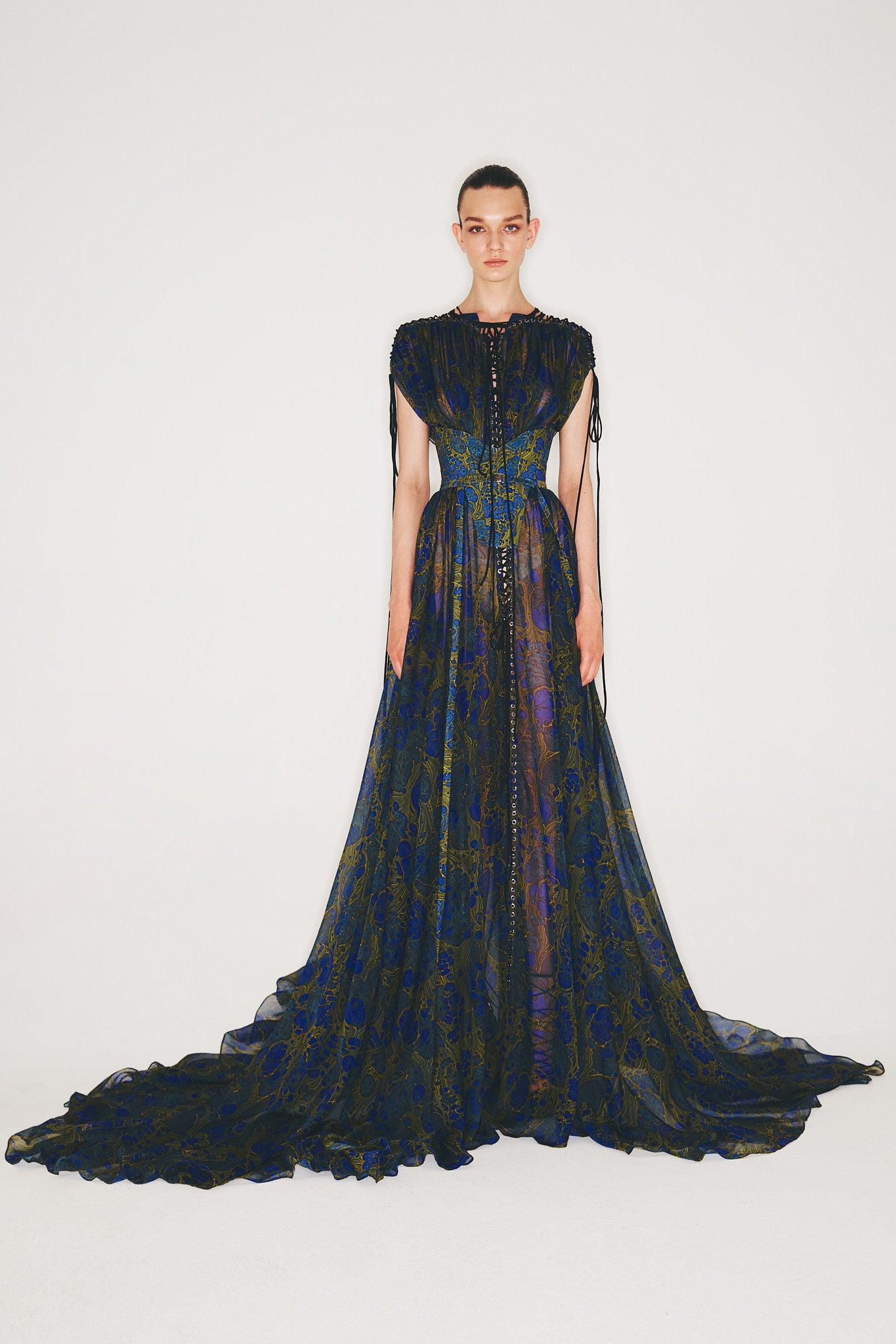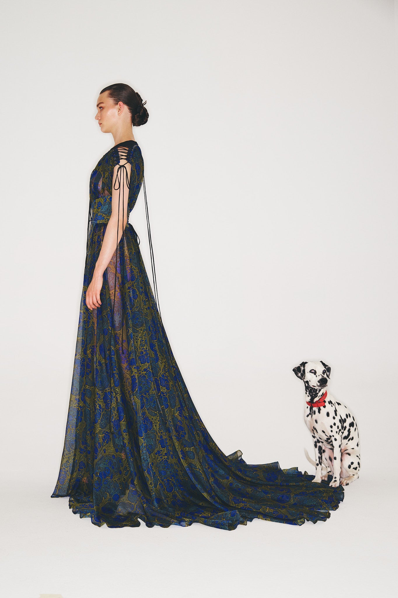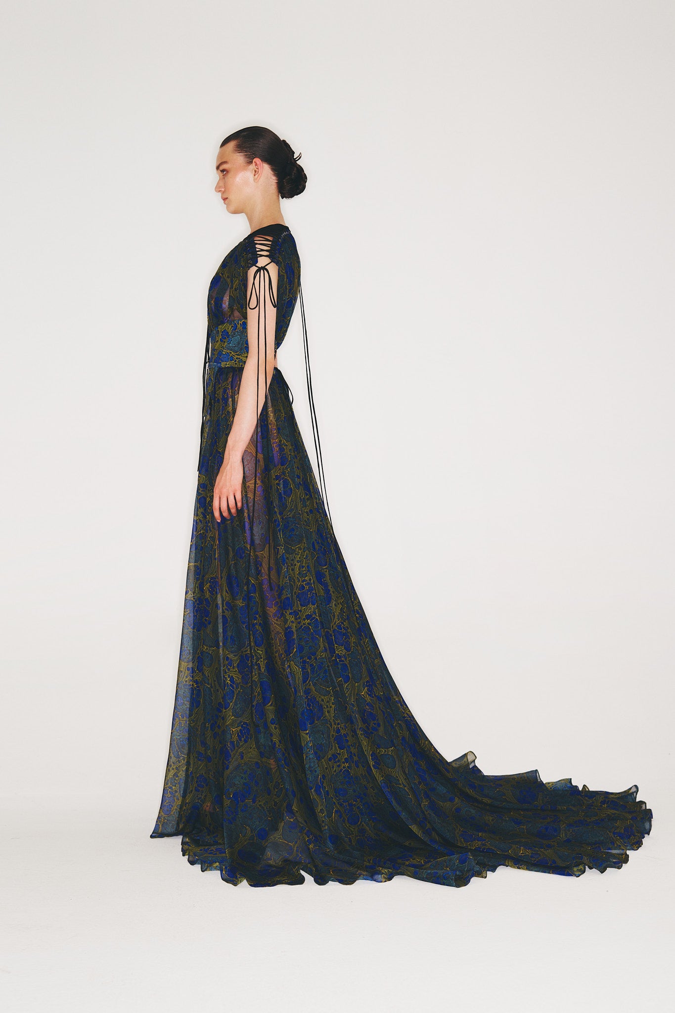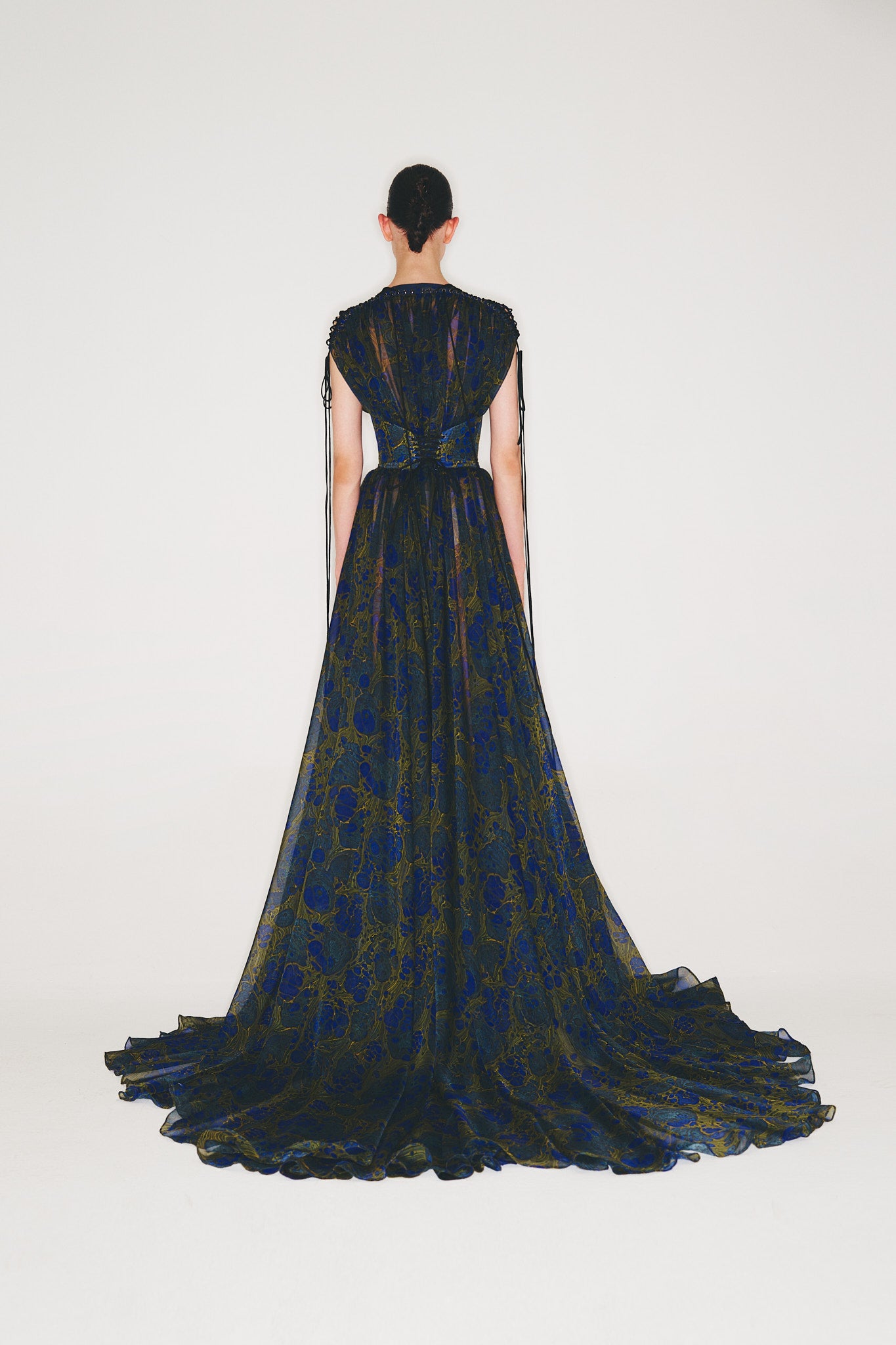 Paper marbling (Ebru) printed maxi chiffon dress with lacing detail on shoulders paired with corset.