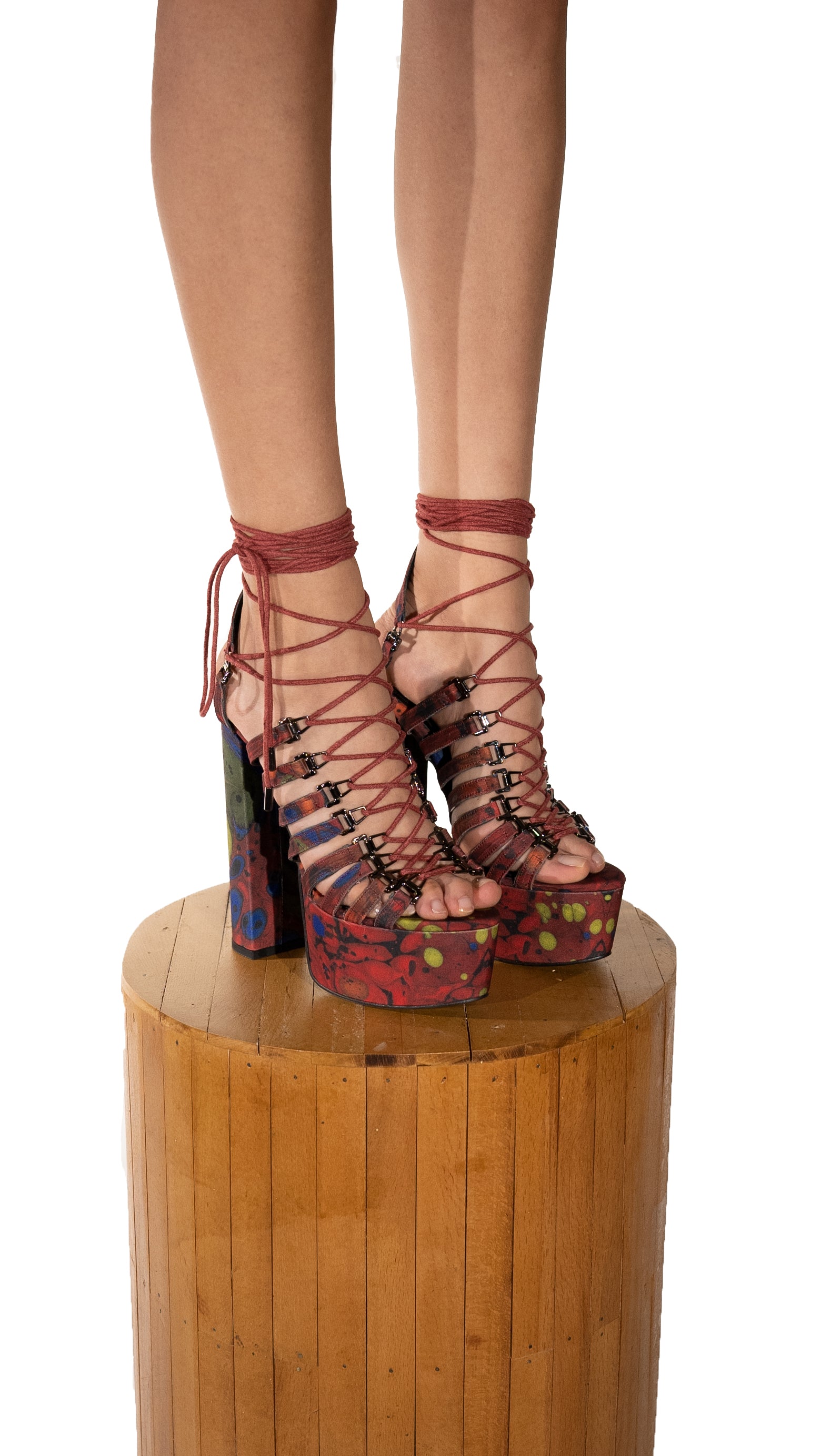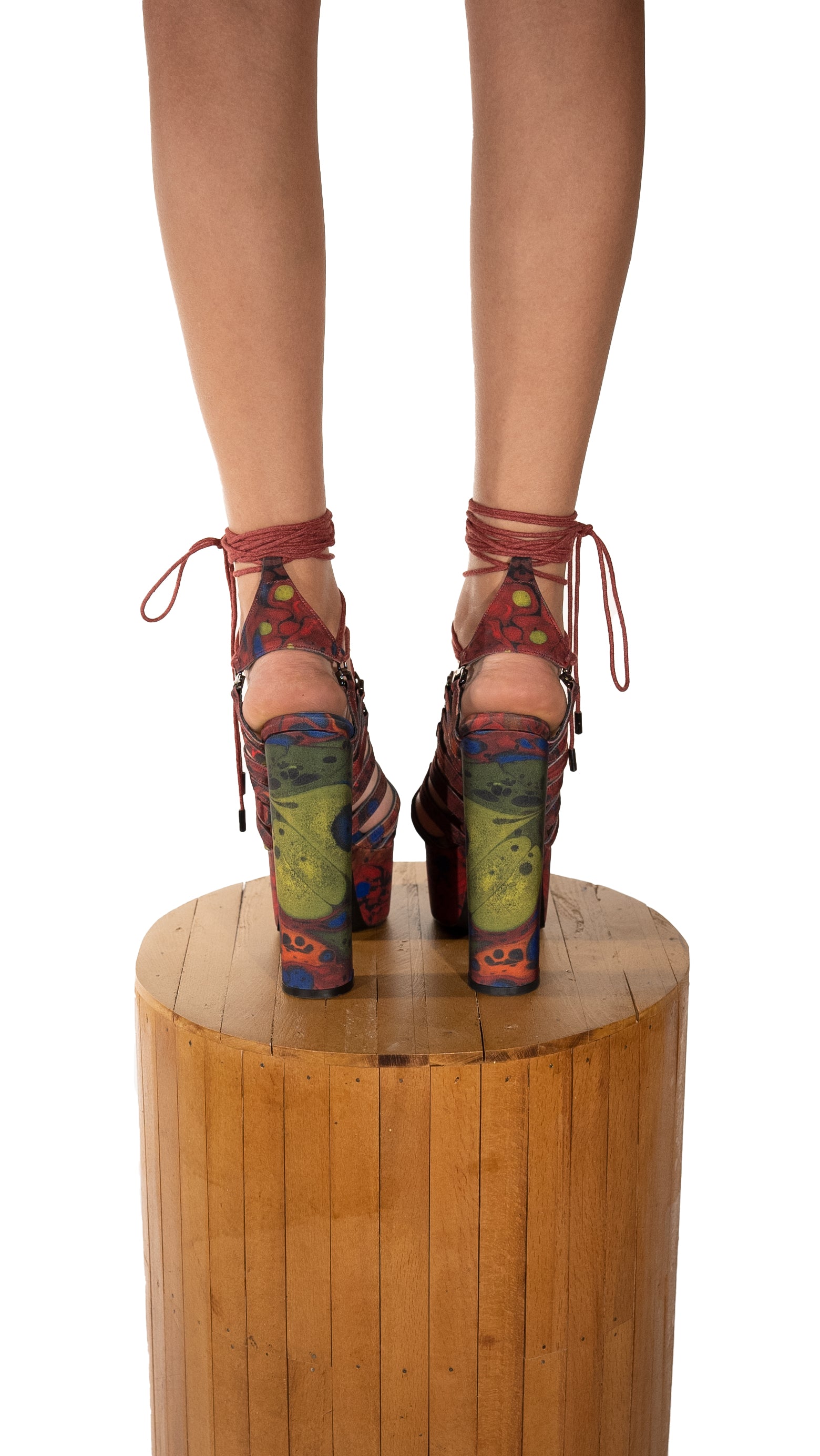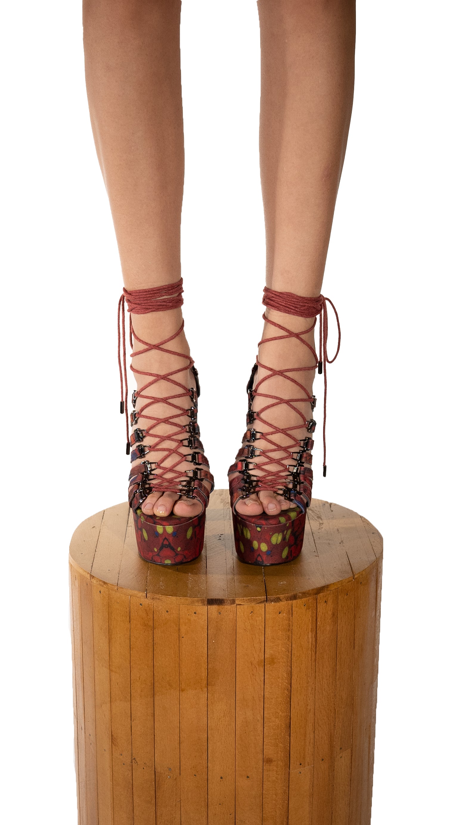 These crepe pumps feature a high block heel and a platform with ankle lace up.