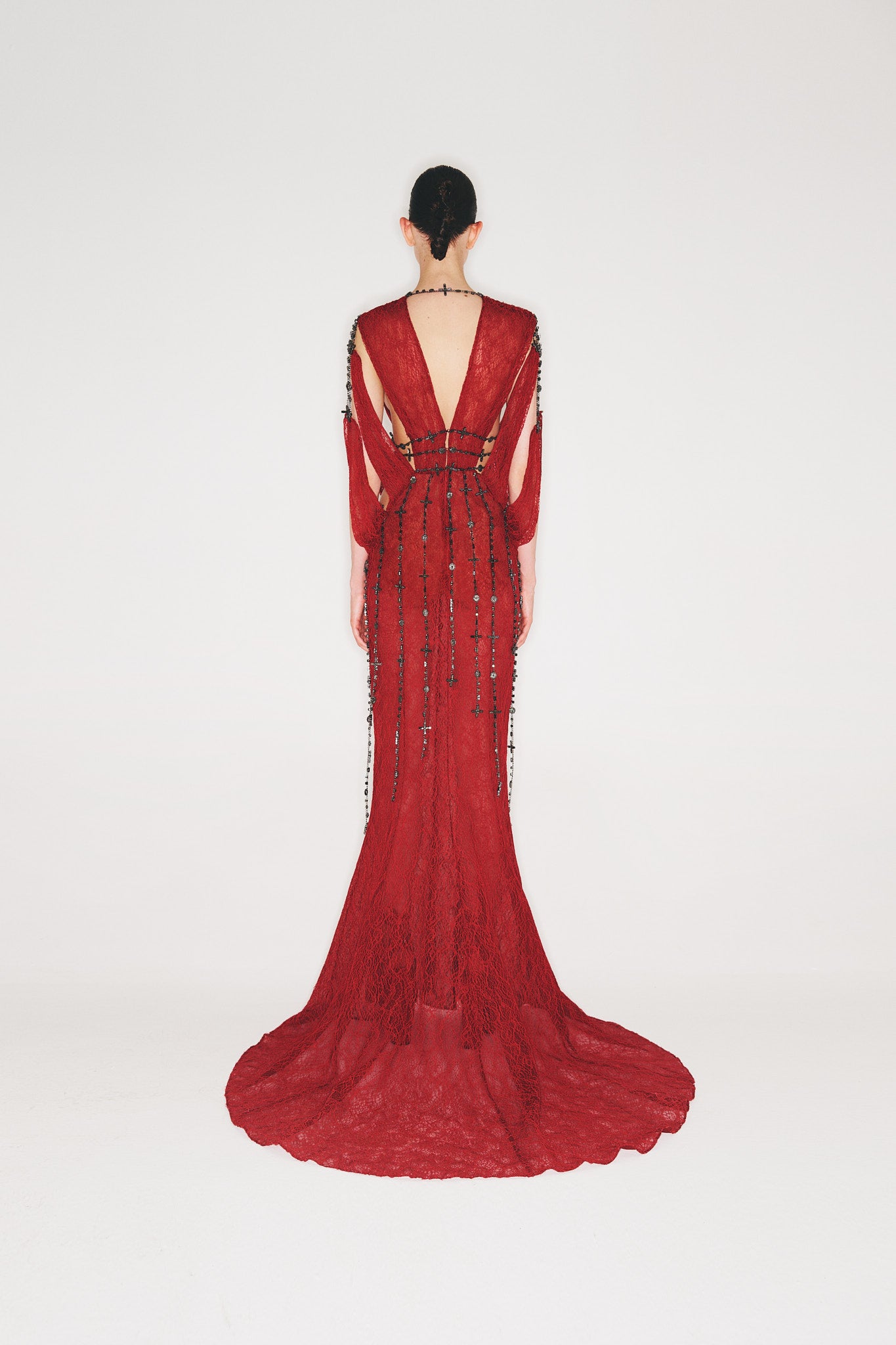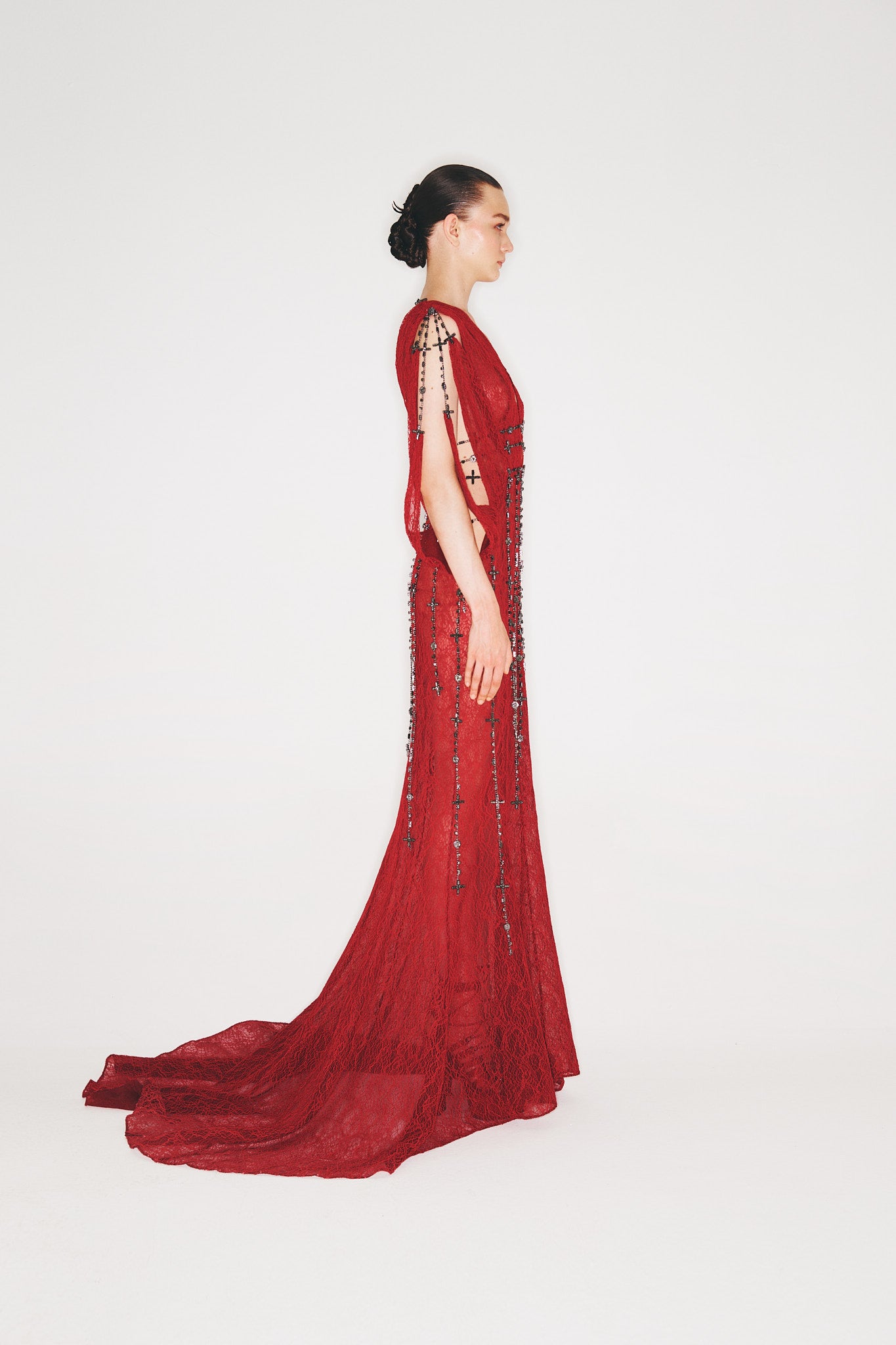 V-neck maxi lace dress with draped sleeves and chain accessory details.