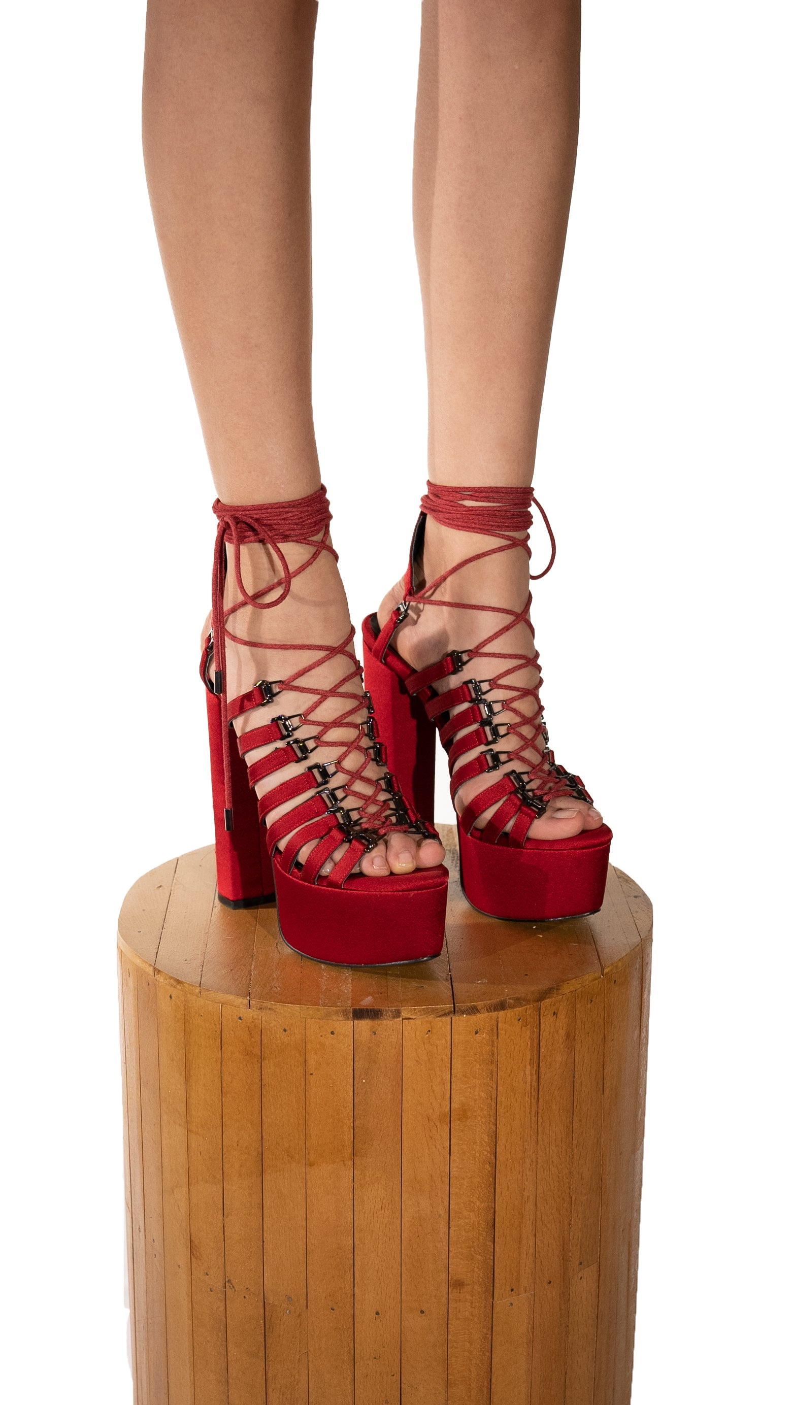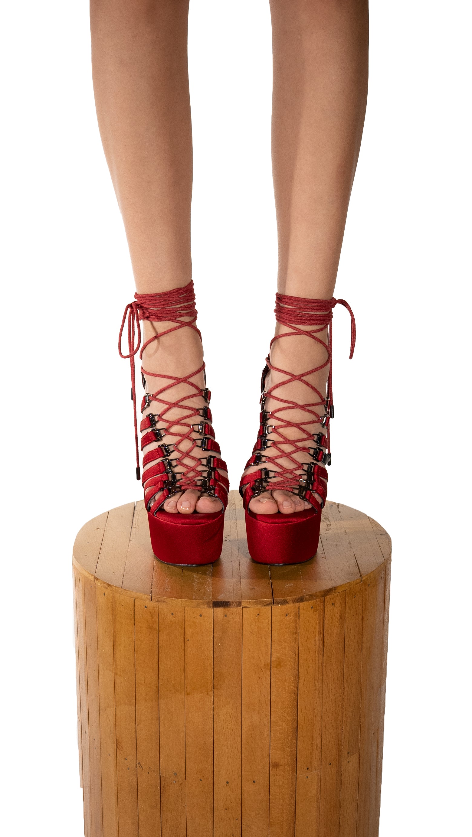 These crepe satin pumps feature a high block heel and a platform with ankle lace up.
