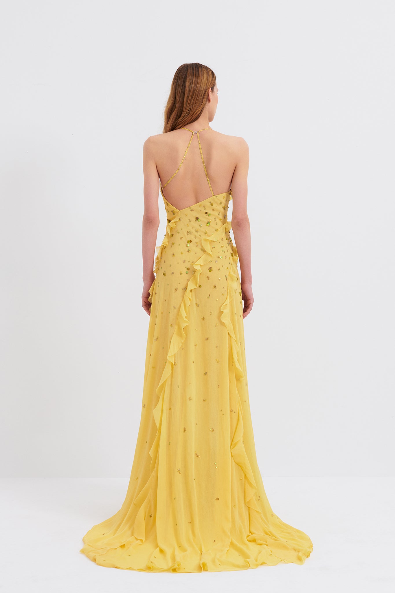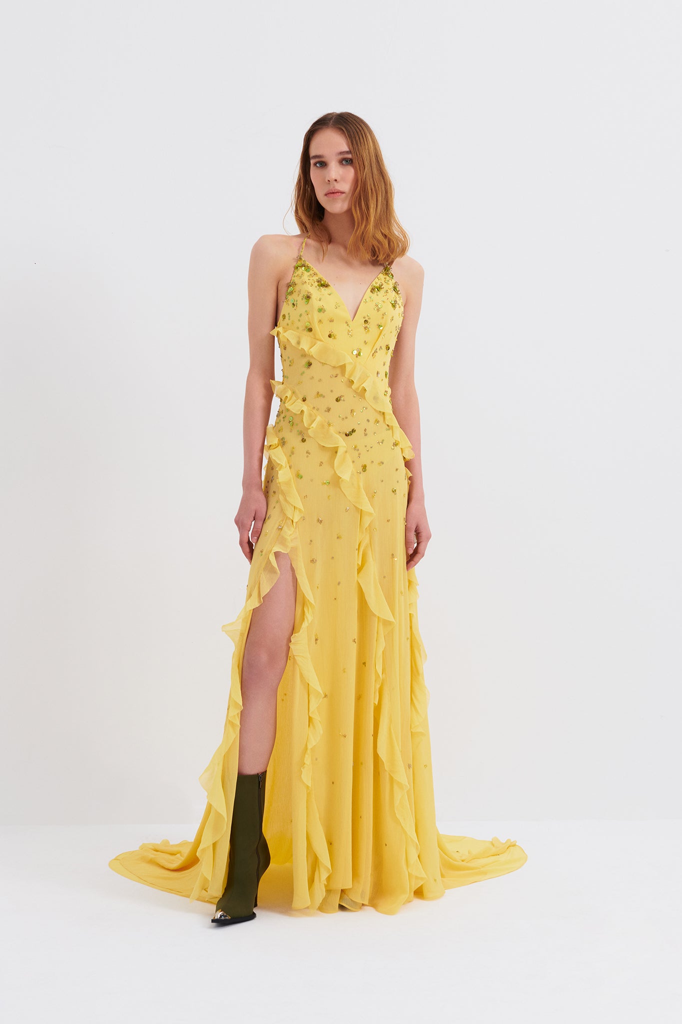 Ruffled v-neck tailed maxi dress features bead and sequin hand-embroidery details and front side slit. It fastens with a concealed side zip closure.