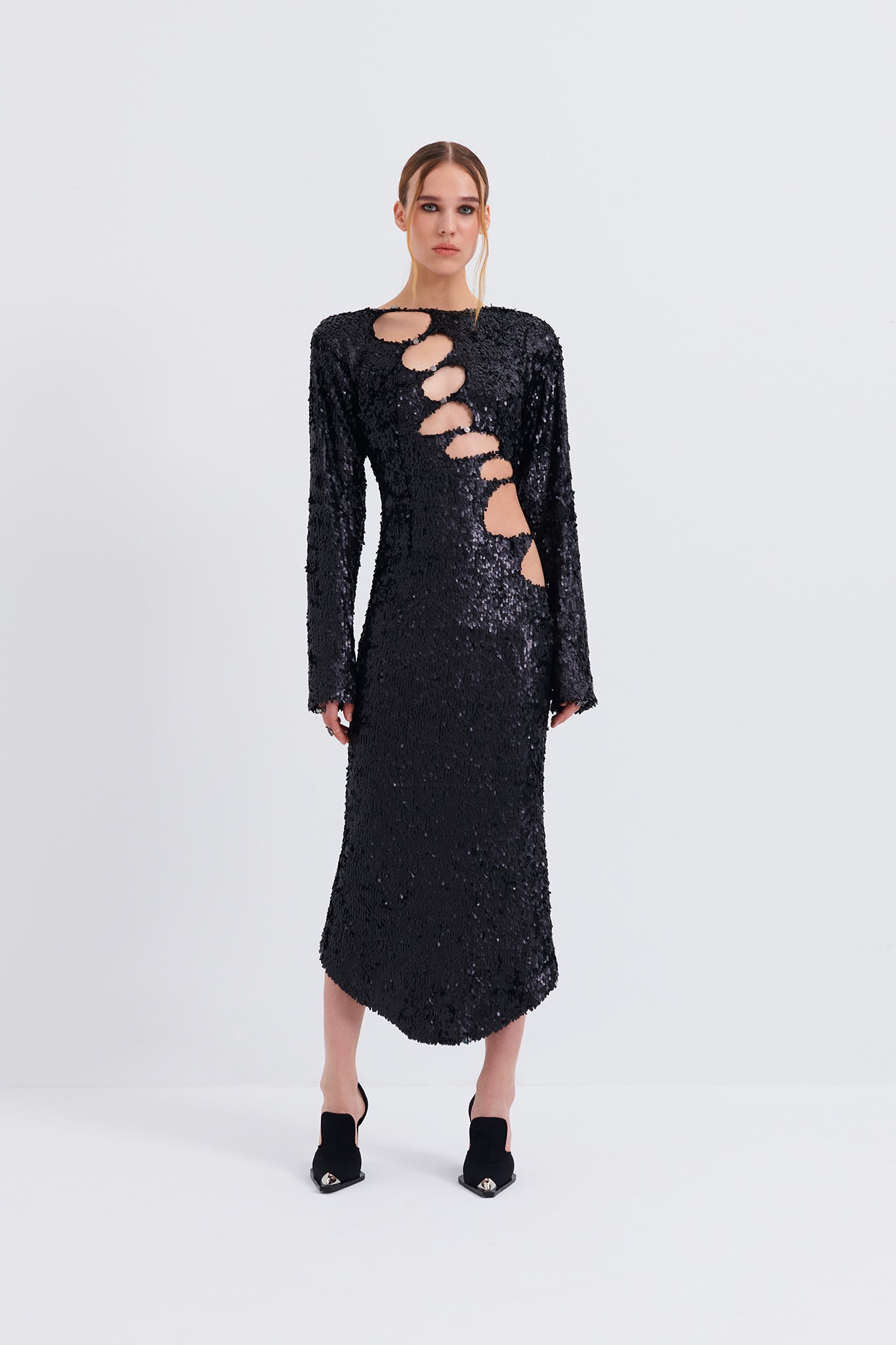 Sequin embellished cut-out midi dress features unfunctional metal buttons at the front and a back slit. It fastens with a concealed back zip closure.