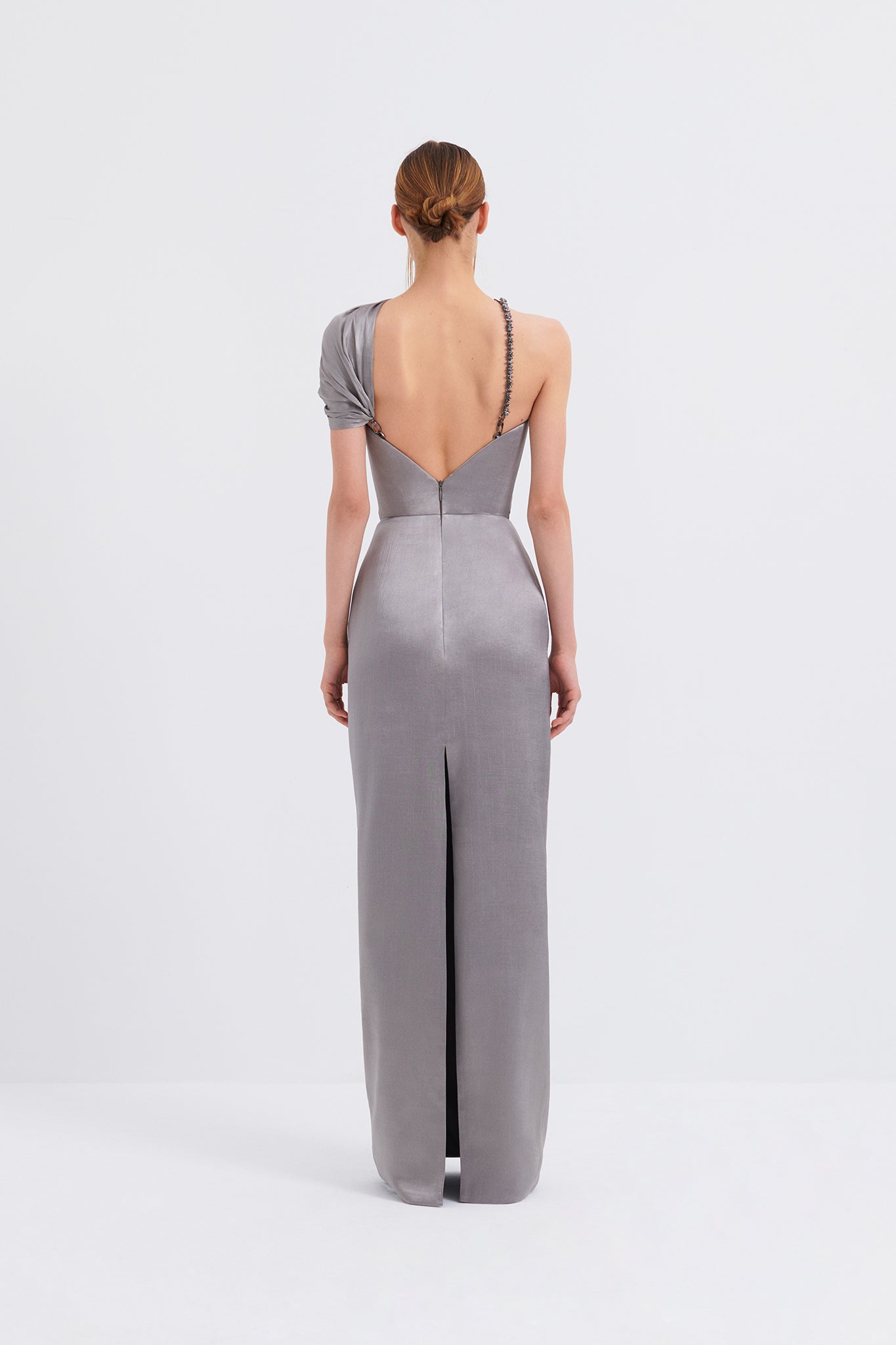 Fitted silhouette silver metallic gown paired with detachable draped off-to-shoulder piece and crystal- embellished metal chain accessories. It has a back slit and fastens with a concealed back zip closure.