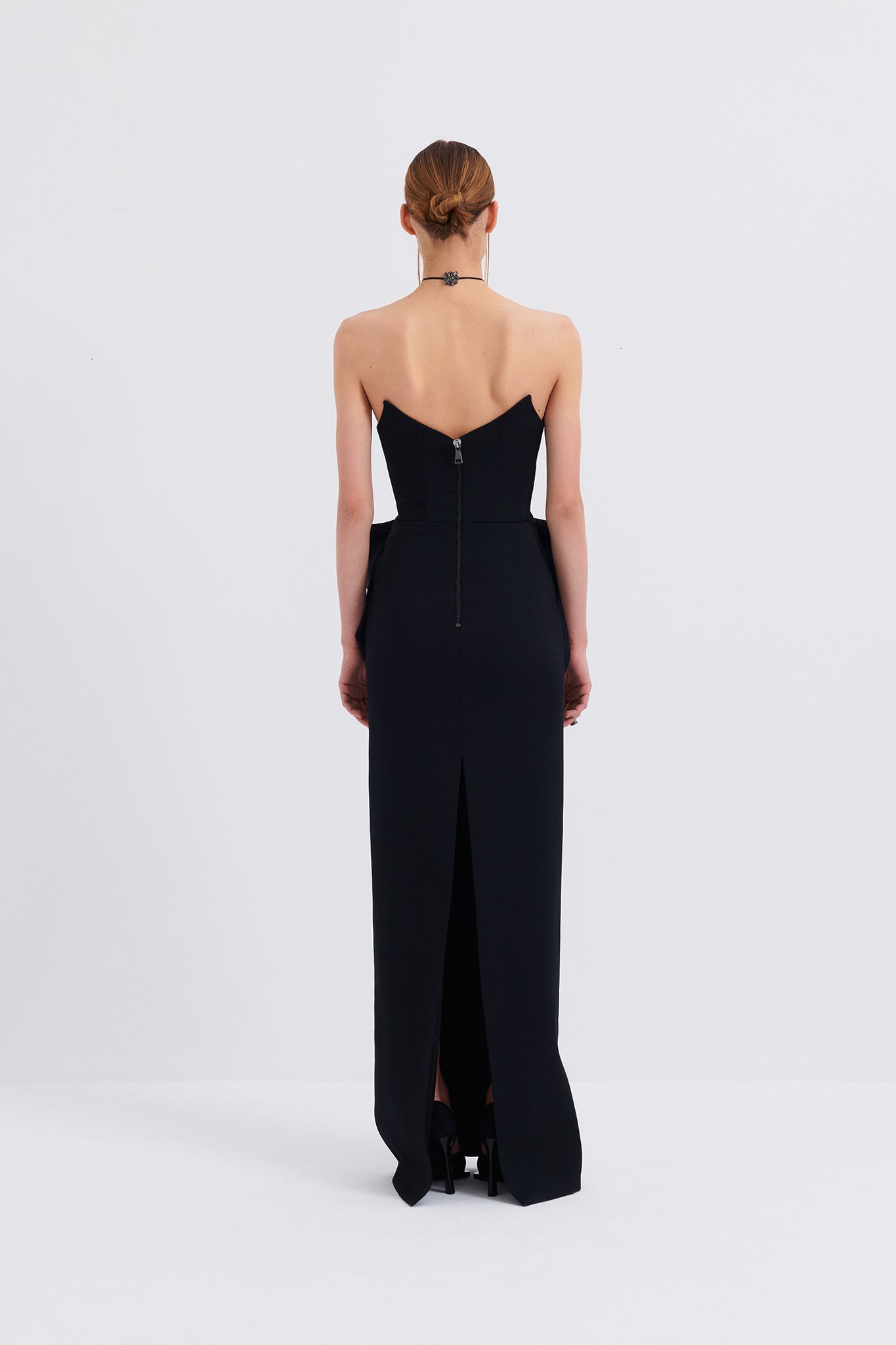Fitted silhouette strapless maxi dress features a bow detail at the front and a back slit. It fastens with a visible metal back zip closure.