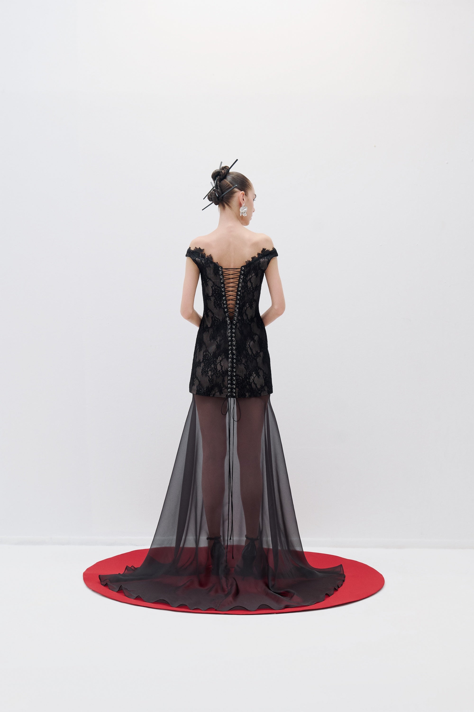 A dress with a mini lace inner lining, a boned top, and a special chiffon detail on the skirt.