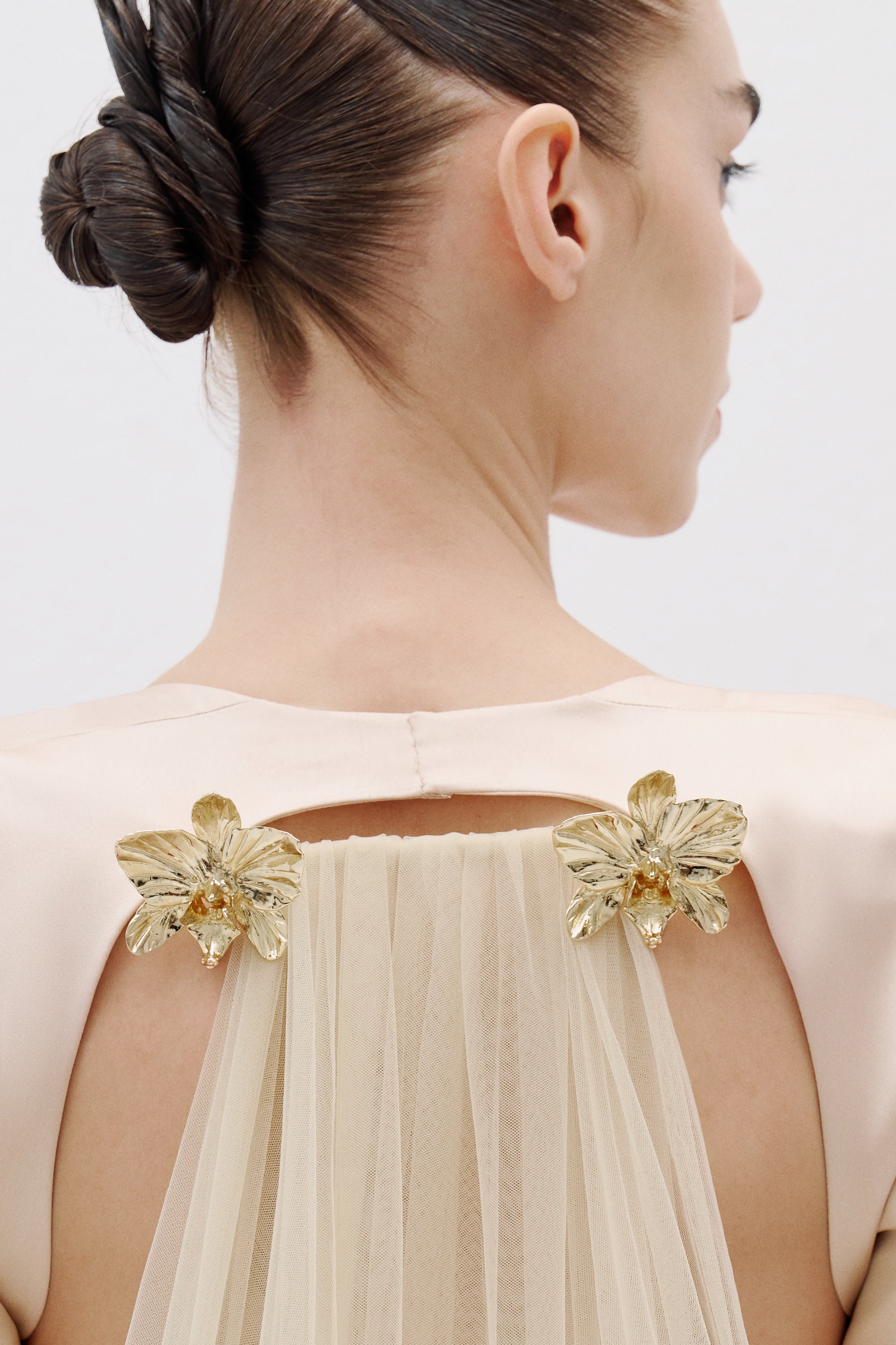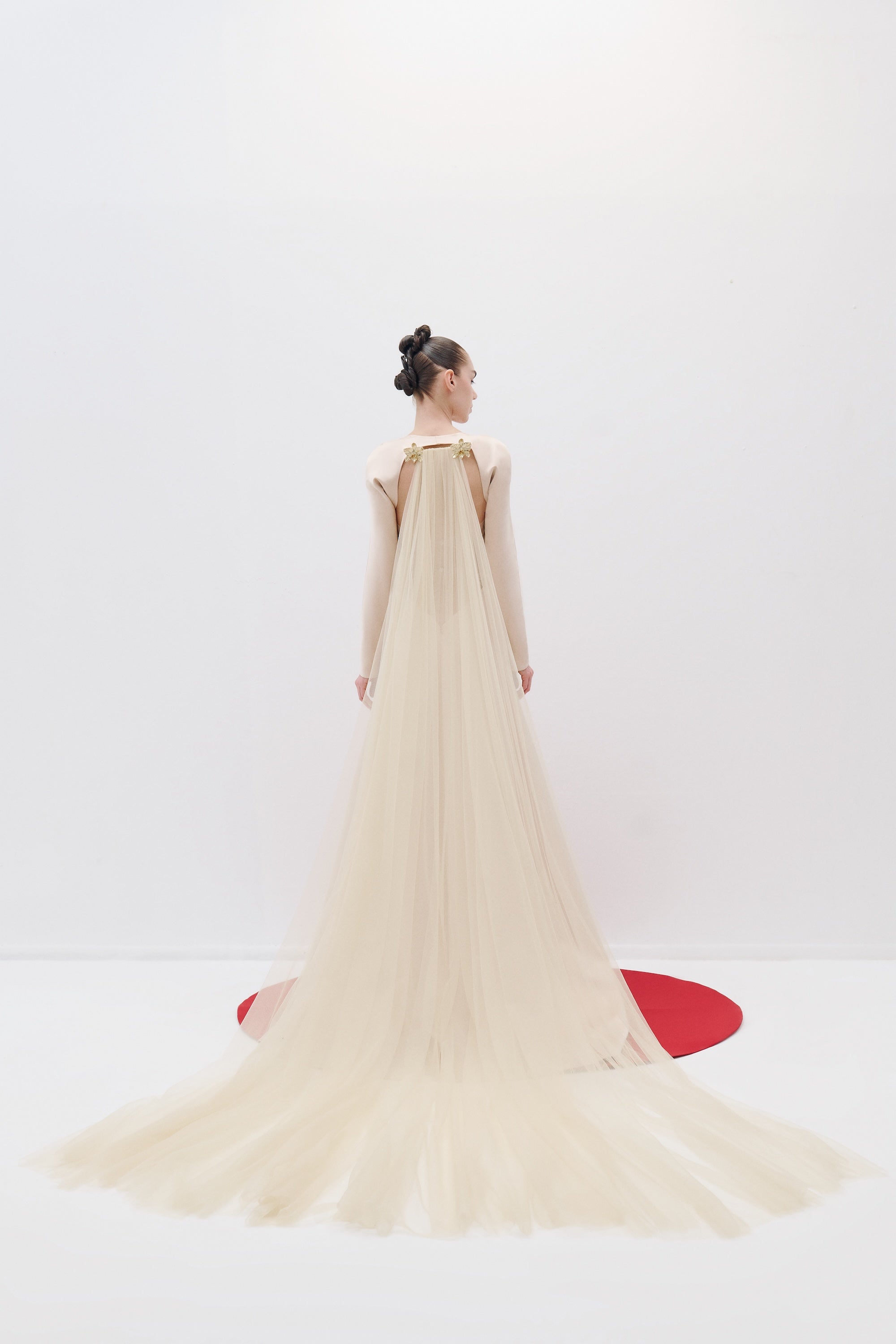 A strapless dress with a form-fitting waist and a slight flare at the skirt. It features accessory details, a bolero, and a tulle train at the back.