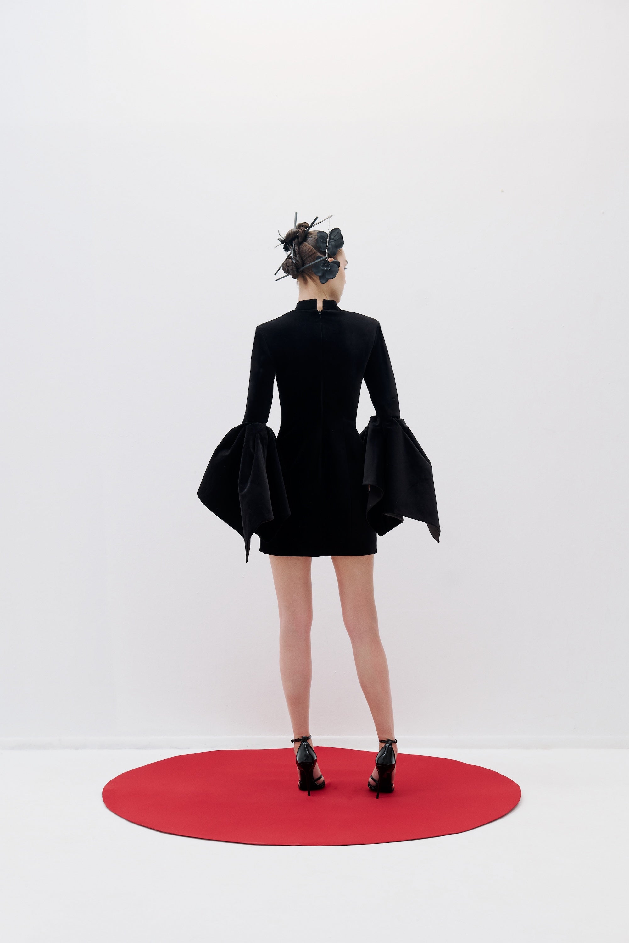 A velvet mini dress with balloon sleeves, a high neckline, and a Japanese collar