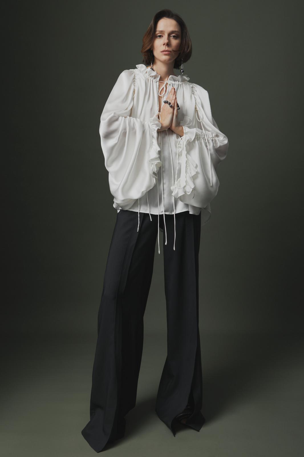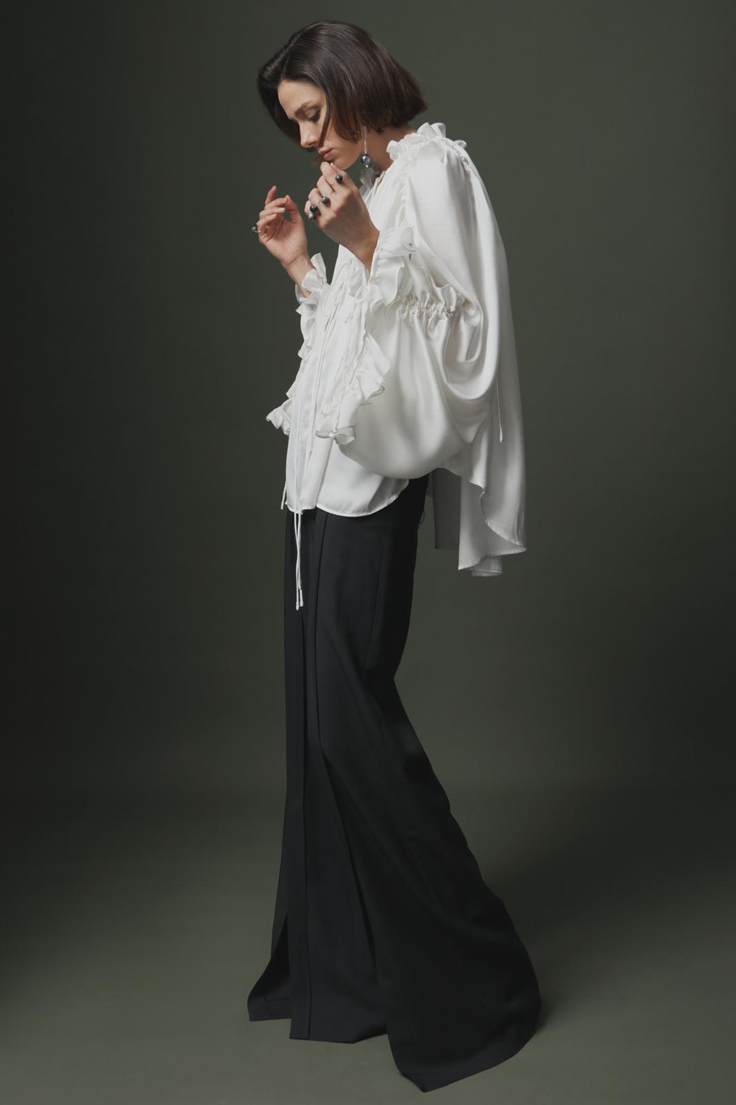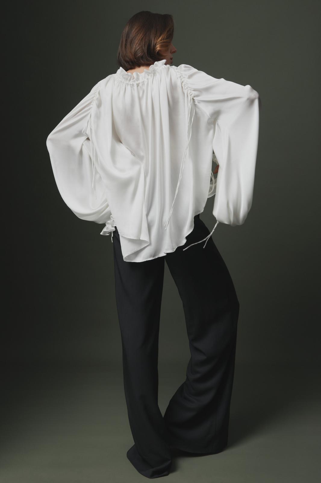 White-colored oversize blouse with adjustable tunnel on the shoulders and sleeves and ruffle sleeves on the cuffs.